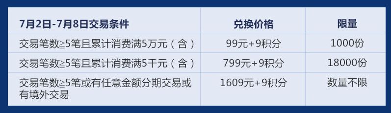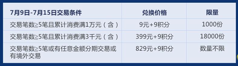 每个持卡人每周只能换购一个礼品。 如持卡人已满足的最高交易条件对应兑换价格的礼品已兑换完毕,可以选择已满足的其他条件所对应兑换价格进行兑换。 第一周:7月12日抢兑