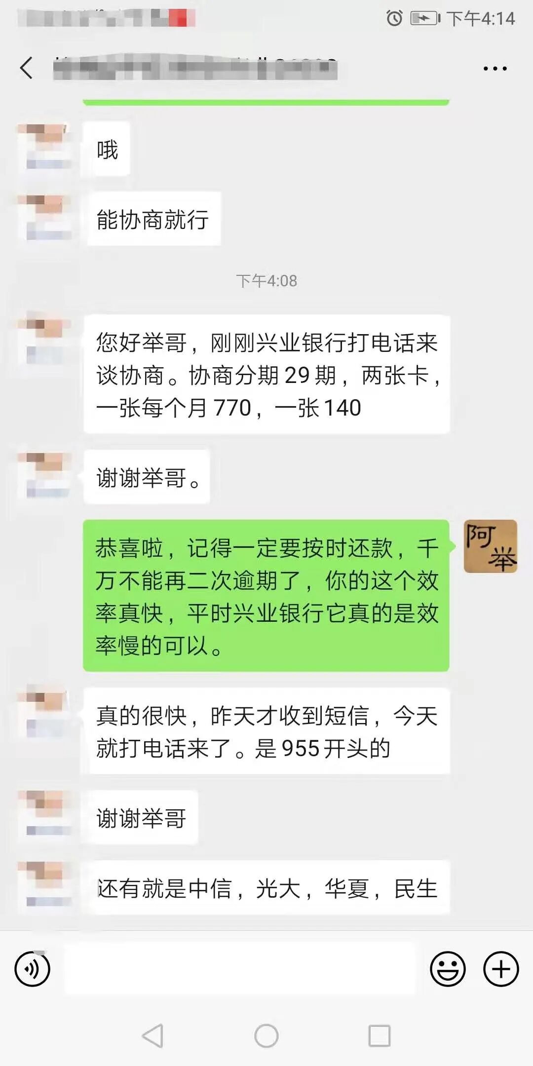 问题1 广发逾期4个月怎么和银行协商还款?疑问解答! 网友问: 浦发信用卡逾期到底如何处理,我只想把催收给解决掉,还有我会被银行起诉吗,他们一定要让我一次性还甭,毕竟我的欠款额度还是比较大的,现在也没有那么多钱 阿举答: 每个人都有不同的逾期原因。逾期之后面对银行的催收不知所措,害怕骚扰家人、害怕上门、害怕接催收电话等等。这是目前所有负债人可能面临的情况,那么这个时候应该怎样处理呢? 第一就是不要惊慌,事情既然已经发生了,就要想办法去解决,也不是老赖,又不是诈骗,是想还钱只不过暂时没有全额还款的能力。 第二就是留存好证据,比如录音、截图、照片等等,如果有暴力催收的情况,在你以后的诉讼中是非常有帮助的。 第三就是主动联系银行,说明情况,看能不能得到银行的谅解,减免部分利息,但是这样也是要全额还款的,如果没能力也可以和银行谈协商分期,不过是有利息的,一般期数较少,同意的银行也不多。 第四就是看能不能寻求家人和朋友的帮助,优先解决逾期较久金额较大的信用卡 如果以上都不能实行,也可以让我们代协商和银行沟通停息分期。利用科学有效的手段进行重组,减轻压力,回归正常生活。停止利息和违约金增长,催收电话骚扰,起诉风险! 每个不同的银行对于不同逾期阶段给予的政策都是不同的。如果需要解答,首先描述好自己欠多少?欠的是哪个行,逾期多久。 但是那些问我怎么样不需要还的,呆账是否需要还的。被代偿是否需要还的免开尊口。 我解答的意义在于帮助那些陷入困境的人, 我始终站在欠债还钱天经地义的立场。 问题2 网友问: 我有一张交通银行的信用卡,现在逾期三个多月了,每天都 有很多的催收打电话过来,我实在是不想接,不知道接了怎么说,现在没有钱还?我该怎么跟银行协商? 阿举答: 面对负债,你们知道商业银行信用卡监督管理办法有哪几条是保护你们的吗? 我归纳了一下,你们可以耐心看一下! 第四十九条:信用卡未经持卡人激活,不得扣收任何费用。 第五十七条:发卡银行收到持卡人还款时,按照以下顺序对其信用卡账户的各项欠款进行冲还:逾期1-90天(含)的,按照先应收利息或各项费用、后本金的顺序进行冲还;逾期91天以上的额,按照先本金,后应收利息或各项费用的顺序进行冲还。 第六十八条:发卡银行应当对债务人本人及其担保人进行催收,不得对与债务无关的第三人进行催收,不得采用暴力、胁迫、恐吓或辱骂等不当催收行为。对催收过程应当进行录音,录音资料至少保存2年备查。 第六十九条:信用卡催收函件应当对持卡人充分披露以下基本信息:持卡人姓名和欠款余额,催收事由和相关法规,持卡人相关权利和义务,查询账户状态、还款、提出异议和提供相关证据的途径,发卡银行联系方式,相关业务公章,监管机构规定的其他内容。 发卡银行收到持卡人对信用卡催收提出的异议,应当及时对相关信用卡账户进行备注,并开展核实处理工作。 第七十条:在特殊情况下,确认信用卡欠款金额超出持卡人还款能力、且持卡人仍有 还款意愿的,发卡银行可与持卡人平等协商,达成个性化分期还款协议。个性化分期还款协议的最长期限不得超过5年60个月。 68.69条面对催收也要用法律的手段保护自己的权益。70条是负债者的春天,把握机会。 如果你也是信用卡逾期,不知道该怎么办,加我为你解答! 问题3 网友问: 我有一张浦发银行信用卡现在逾期了催收打电话说要立案,会不会真的被银行起诉掉啊,我想跟银行协商分期还款但是他们不同意? 阿举答: 如果您想停息挂账,持卡人应做以下三件事: 首先,面对催收,你不能逃避。持卡人和银行之间的电话记录在案。如果持卡人说错话、撒谎、失去联系等。在收款期间,你申请暂停付款的机会将大大减少。 第二,说明实际情况,不要让银行不收你,你应该主动联系银行解释你目前的经济状况、失业情况、家庭困难等。让银行真正感受持卡人的困难 第三,主动联系银行,提出暂停支付和分期付款的要求,并明确告知银行有多少收入,可以开始偿还多长时间,最高可以偿还多少,需要多少期。记住不要发表大的声明,说一些不切实际的话,例如,如果你欠了10,000元,你说你想分60期偿还,这是不现实的,银行也不喜欢。 最后打个广告,逾期一次性偿还不了跟银行协商个性化分期还款是最好的解决方法,如果自己协商不了,可以找我们协助协商,专业事交给专业的人处理! 在你犹豫不决的时候其他人选择了债务重组跟银行协商个性化分期还款,在你还在纠结的时候选择的人己经按照 协商的方案还款,而你又多了几期利息和违约金,仍然还是面对每天催收的骚扰和恐吓,同时也多了银行对你的起诉风险。在能协商的时候就赶快协商吧!千万别拖到被起诉才着急想解决的方法,这个时候就完全被动了! 很多人打银行电话去申请分期还款,但是银行前期基本上都会说没有这个政策,这基本上是业内默认的行规!如果每个人打过去电话银行都同意个性化分期还款,那世界就和平了,银行相关催收就没有了!我们要做的是找对方法和渠道让第三方介入来协商与相对应银行的协商分期,然后坐等银行主动打电话给我们来协商,而不是愣头青一样直接找银行协商,想协商个性化分期还款的可以关注我们私聊,给你提供相关协商方法让银行主动来找你协商分期! 总之如果在协商的道路上你