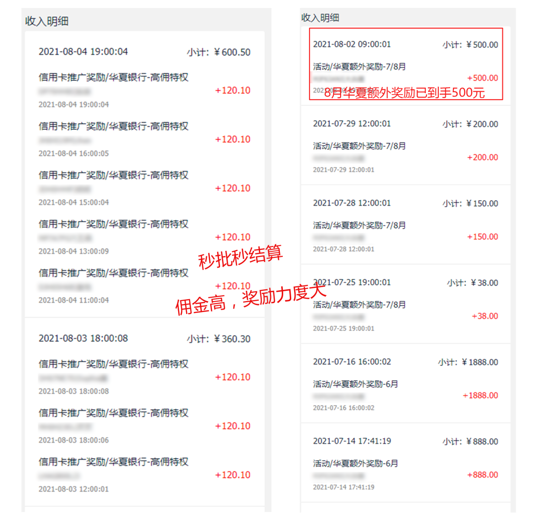 华夏信用卡放水刷爆朋友圈,不少卡友纷纷上车,石锤华夏信用卡放水,额度有高有低,5千-5万不等! 近期华夏放水刷爆朋友圈,你还没趁机上车吗? 不少卡友名下信用卡几乎全部空卡,负债率高达95%,征信记录三个月查询超过15次。可华夏还是下卡了。 还有卡友近三个月查询20多次,全是信用卡审批,其他都被拒,但借助这次华夏信用卡放水,下了35000。还是不错的。 除此之外,其他下卡的案例也不少,就不一一分享了,给大家展示一部分下卡案例! 从卡友的例子来看,这次放水的卡种:华夏银行云闪付联名卡 SHENKA 申请技巧 1、华夏云闪付主题金卡目前很多都下卡了,不过要注意,无论你是首卡还是二卡,资料都是要重新填写的,二卡用户一般会有回访电话,而且还要去网点面签激活。 2、如果你审核通过了,短信就会直接告知下卡额度,如果看不到额度的可以回复YE加卡号后四位可以查到额度。 3、申请信用卡无论是放水卡种还是普通卡种,尽量选择合适自己的信用卡,这样成功率高。 近期很多人因查询记录过多导致申卡失败的,建议可以先优化一下,后期再申请。 注意:征信有逾期的不要申请,把逾期处理之后再去申请。 SHENKA 云闪付主题卡权益 新户首刷 新户首笔达标云闪付支付交易,可获得交易金额6.2%返现,最高不超过62元。 笔笔返现 华夏银行云闪付主题信用卡绑定至云闪付APP可享云闪付支付消费金额1%的还款金返现,单客户每月最高返现62元。 积分月月刷 6888积分月月刷,月月拿。云闪付账单分期免两期手续费专享优惠。 美食代金券 每周六、周二,6.2元享受奈雪的茶大杯、呷哺呷哺30元代金券。 支付享满减 每周六、周二,云闪付、京东、12306、本来生活、去哪儿、苏宁易购支付享62减30。 云闪付红包随机抽 白金卡持卡人实名注册云闪付APP并绑卡,在指定境外线上商户通过手机PAY、云闪付APP进行消费,可获得一个金额随机的云闪付红包,红包金额最高588元人民币同一用户每个活动日限1个红包。 近期办理华夏信用卡 额外补贴高!!! 审批通过奖励涨价至170元/张! 额外补贴最高85元! 审核通过秒结算 全网独家秒结系统,平台唯一一家全流程秒结产品!代理力推产品,除全网最高佣金外,本月还增加5大华夏福利,多个补贴助力您推广! 推荐指数:☆☆☆☆☆ # 华夏五重福利 # #华夏首推奖# 活动详情:2021年7月31日之前未获得华夏银行佣金,只要在8月份有华夏订单分佣,额外奖励18元。 #华夏超越奖# 活动详情:8月申请且8月分佣的张数超过7月分佣的张数,即可获得38元超越奖励,仅限7月结算1-3张的用户参与。 #华夏单日批卡奖# 8月申请且在同一天结算的华夏初审版订单达到20张,可额外叠加388元。 #华夏累计批卡奖# 活动时间:7月21日-8月31日 活动详情:活动期间内办理华夏银行初审版订单,成功分佣的订单数量累计达到对应阶梯即可获得相应奖励金额,最高可拿1888元,详情看活动页面。 #华夏招募补贴奖# 活动时间:8月1日-8月31日 活动详情:您招募新代理,新招募的代理1个月内完成一笔华夏银行直推业务,您可额外获得奖励。招募的人数越多,额外奖励越多,最多额外拿488元。 【欢迎各位小伙伴加入我们】 — 推 荐 阅 读 — 猜您喜欢往期精选▼ 干识|别pos机跳码最全策略货 干货|识别POS机虚假商户查询方法 2020年银联MCC码(商户类型)手续费率查询 13家银行的小黑屋特征,来看看你进了哪家的小黑屋! 速看!这样的支付方式对卡才好! 好看,给小编点个在看~~ 了解更多知识,请关注卡神吧,为您提供信用卡、贷款、理财、保险等资讯及交流! 特别声明1、该文观点仅代表作者本人,卡神吧系信息发布平台,卡神吧仅提供信息存储空间服务。 2、您若发现有侵略您著作权行为,请及时告知,我们工作人员将在第一时间删除侵权作品、停止继续传播。 3、如果你喜欢这篇文章,请帮助我们转发它分享给你身边的好友。 |