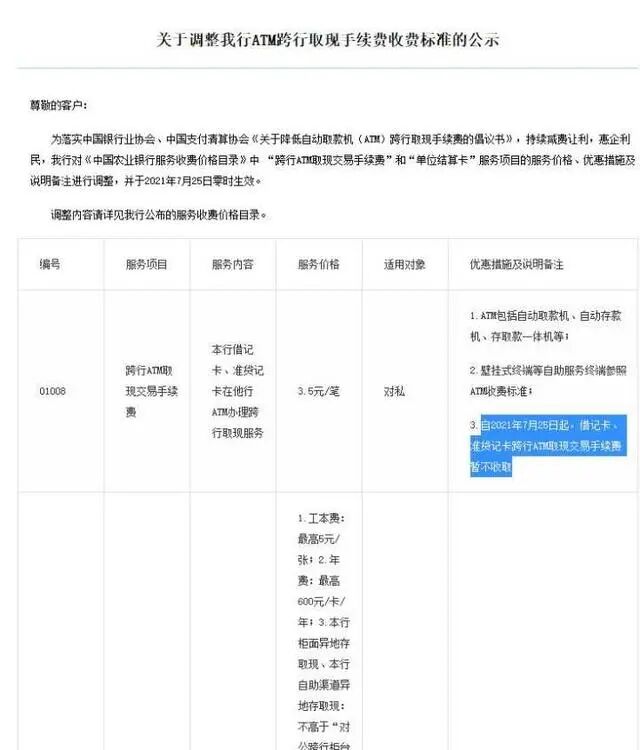 6月25日,中国银行业协会、中国支付清算协会联合发布《关于降低自动取款机(ATM)跨行取现手续费的倡议书》(下称《倡议书》)。《倡议书》中提出,银行ATM跨行取现手续费标准将做下调:每笔不超过3.5元,异地与同城一致。实施降费后,跨行异地取款预计最高降幅80%以上,每年将为群众让利40亿元。 (图片来源:中国银保监会官网) 《倡议书》建议,各银行和清算机构应该在倡议书发布之日起一个月内实施降低ATM跨行取现手续费措施。 如今,一个月时间已至,各银行出台了相应措施吗? 记者了解到,从今天(7月25日)起,多家银行下调自动取款机取现交易手续费。其中工商银行、农业银行、建设银行、中国银行等六家银行均暂免收取境内自动取款机跨行取现手续费;浦发银行、兴业银行等则将境内自动取款机同城、异地跨行取现手续费统一降至每笔3.5元,并对助农取款等业务予以免费。 记者查询各大银行官方网站后发现,减免手续费的公告已经陆续公布。 中国银行在其官网发布公告称:自2021年7月25日起,对跨行同城、跨行异地ATM取现服务暂行免收手续费,恢复时间另行公告。 (图片来源:中国银行官网) 与此同时,中国银行表示,自7月22日17:00起至10月22日17:00止,对中国境内的个人网银跨行人民币汇款业务实行三个月免收手续费的优惠;对中国境内的手机银行跨行人民币汇款业务将继续实行2021年手续费全免的优惠。 农业银行发布公告称:自2021年7月25日起,借记卡、准贷记卡跨行ATM取现交易手续费暂不收取。 (图片来源:中国农业银行官网) 建设银行发布公告表示,自2021年7月25日起,全国范围内免收借记卡及准贷记卡跨行取现业务手续费,具体包括ATM跨行取现、助农取款及农民工银行卡特色取现服务。 如因各类情况导致跨行取现手续费未能自动减免的,建行后续将为持卡人办理退费。 (图片来源:中国建设银行官网) 在此之前,记者曾查询建设银行ATM取现的手续费标准,同城跨行手续费为4元/笔;异地跨行手续费为:取款金额的1%(最低为2元)+2元/笔。而如今免收手续费后,能为大家省下不小的一笔钱。 中国工商银行在官网发布公告:自2021年7月25日起,暂免收借记卡境内跨行ATM取款手续费。 (图片来源:中国工商银行官网) 而在此之前,记者采访时也了解到,工商银行浙江地区储蓄卡跨行取款费用为:4元/笔,储蓄卡在异地其他银行ATM上取款,按每笔取款金额0.5%收取异地取款手续费,最高50元/笔,另外还要加收2元/笔或4元/笔的手续费。 来源:天眼新闻 监制:秦祥祥 审核:张达 编辑:杨胜双 了解更多知识,请关注卡神吧,为您提供信用卡、贷款、理财、保险等资讯及交流! 特别声明1、该文观点仅代表作者本人,卡神吧系信息发布平台,卡神吧仅提供信息存储空间服务。 2、您若发现有侵略您著作权行为,请及时告知,我们工作人员将在第一时间删除侵权作品、停止继续传播。 3、如果你喜欢这篇文章,请帮助我们转发它分享给你身边的好友。 |