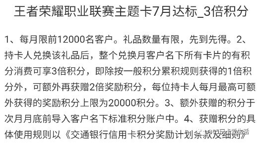 365玩卡交流群 365玩卡——最专业的 金融知识社群! 加入群聊 昨天发的【广发里程神卡凉了,最后一个月可兑换】,一时间卡圈哀鸿遍野,6:1兑换里程的路子不复存在。 其实想要6:1兑换里程,并非只有一种选择。目前交行的王者荣耀卡公认性价比最高。 交行的王者荣耀卡,虽然没有牛卡5倍积分那么给力,但每个月可领3倍积分,按照交行18:1的里程兑换比例,3倍加持后实际兑换比例可以达到6:1,和东航洲际联名卡一致(真情卡3倍搭配东航洲际联名卡实现6:1)。 详情见【交行3倍积分卡及隐藏权益,叠加后最高拿10倍积分】,当时,3倍积分是只能领取一次还是月月可领,还存在争议,现在活动也进行一段时间了,事实证明确实是月月可领。 如图,每月都有: 最受关注的3倍积分权益是这样的: 成功核发王者荣耀主题卡的客户,自核卡当月消费总额超2888元(含),达标次月即可至买单吧APP使用5积分换购3倍积分权益。每月限前12000名客户。 3倍积分包含1倍基础积分和2倍奖励积分,每月额外奖励积分上限为20000分。但看这样的权益似乎也很普通,但隐藏福利则是:使用5积分兑换了三倍积分权益之后,客户名下所有交行卡次月有积分消费均可享3倍积分! 这样一来,交行卡就可以通过组合拳,玩各种多倍积分叠加活动了。如果同时持有蜜卡(3倍积分)、红牛卡(日常5倍积分/生日月8倍积分),然后再叠加生日月/生日当天的多倍积分,那交行积分还不蹭蹭蹭往上窜?! 还有新户礼权益也很诱人: 在兑换里程方面,可兑换东航、国航、海航、亚万里程,比例都是18:1(3倍后6:1)。按每万里程价值400元计算,回馈率差不多在0.6%左右。还算不错。称其是牛卡的最佳替代,不为过。 近期最值得参加的信用卡活动 7月26日-10月27日,邮储银行储蓄卡活动,5折话费,白拿50元!7月26日-10月27日,邮储银行储蓄卡活动,邮储银行借记卡活动合集,共几百元羊毛!即日起-10月3日,光大银行信用卡活动,光大百元羊腿!还送上万积分 7月19日-9月26日,中信银行信用卡活动,中信送10台车+2700万份奖励! 7月1日-9月30日,农业银行信用卡活动,农行2重返现,可叠加! 即日-2022年5月31日,民生银行信用卡活动,民生车卡返现延期!每月500元持续1年即日-12月31日,多行信用卡借记卡活动,全国多行卡种多网点,任意加油满200均可减20! 即日-9月30日,工商银行信用卡活动,工行领15元微信立减金!无需消费可直接领6月15日-9月30日,招商银行信用卡活动,招行5000大羊毛!活动攻略+避坑指南6月1日-8月31日,平安银行信用卡活动,平安最高10倍积分,可拿百万积分!更多精彩推荐 提额技巧 | 信用卡申请 | 信用卡办理 申卡顺序 | 信用卡逾期 | 信用卡额度 航空里程 |信用卡分期 |信用卡账单 | 卡圈干货 刷卡用卡 |养卡玩卡 | 用卡权益 |信用征信 薅羊毛 |信用卡还款 | 信用卡借贷 |信用卡负债 信用卡优惠|工商银行 | 中信银行 | 中信里程攻略 农业银行 | K宝大法 | 南航白金 | 悠然白金 | 易卡 一篇玩转招行 | e招贷 | 掌上生活 | 浦发银行 浦发AE白 | 世界卡 | 平安银行 | 旅游白 | 标准白 车主卡 | 沃尔玛 | 魔力卡 | 女人卡 | 京东卡 广发DIY卡 | 兴业提额 | 工商银行提额 | 亚万联名 免年费白金卡 | 中信信用贷款 | 6招破招行黑屋 你知道怎么申卡玩卡吗? 你知道怎样用信用卡融资吗? 快来加入我们的玩卡群吧!!! 和各个银行的高额度资深卡友面对面交流他们的玩卡秘籍,进群扫码添加365客服企业微信或点击文末“加入群聊”按钮,验证语“卡神”。 福利多多 365玩卡--最专业的金融知识社群! 群内最热主题 1、信用卡融资技术 2、大额卡秒批实操 3、提额的八大核心 4、银行风控潜规则 5、羊毛积分如何薅 6、套卡组合赚里程 了解更多信用卡权益和信用卡融资信息 请点击按钮进群交流↓↓↓ 365玩卡交流群 365玩卡——最专业的 金融知识社群! 加入群聊 就来点个在看吧! 了解更多知识,请关注卡神吧,为您提供信用卡、贷款、理财、保险等资讯及交流! 特别声明1、该文观点仅代表作者本人,卡神吧系信息发布平台,卡神吧仅提供信息存储空间服务。 2、您若发现有侵略您著作权行为,请及时告知,我们工作人员将在第一时间删除侵权作品、停止继续传播。 3、如果你喜欢这篇文章,请帮助我们转发它分享给你身边的好友。 |