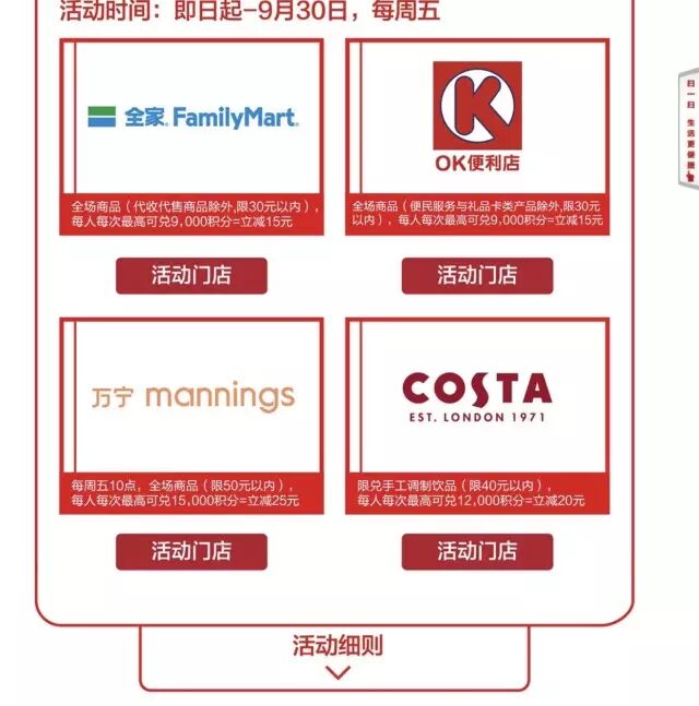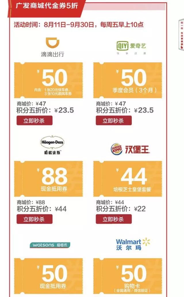 积分半价兑兑兑,强势袭来。 精明的您还能HOLE住吗? 1 活动时间(交易日):2017年8月1日-9月30 日(周一至周五10:00点,抢完即止) 活动路径:限“发现精彩”APP(选择“广发商城-限时秒-积分红包大派送”活动专区) 活动内容:用“1广发积分+0.01元”抢购红包,抢购成功获以下奖励: 2 线上代金券5折积分购 活动时间(交易日):2017年8月11日-9月30日(逢周五10:00点,抢完即止) 活动地点:限“发现精彩”APP(选择“广发商城-限时秒-积分5折购”活动专区) 活动内容:以半价[使用现金或“现金+ 广发积分(可抵10%)”支付]购指定代金券。 (具体代金券以商城公示为准) 3 线下商户积分5折兑 活动时间(交易日):2017年8月11日-9月30日(逢周五)名额有限,先到先得。 活动地点:活动商户指定门店(详见广发卡官网-信用卡-积分商户) 活动内容:购全场任意商品,享以下优惠:(原600广发积分=1元,现300广发积分=1元) 活动Q&A,为精明的您解惑 请问1积分红包活动中的积分奖励什么时候能够到账? 成功支付后的次周五前奖励至扣减1广发积分的信用卡。 请问以上活动仅能周五参与吗? 不是的。活动1周一至周五均能参与,活动2和活动3,均为周五参与。且各个活动均名额有限。其中活动3各商户优惠可共享,每商户名额有限,兑完即止。具体开始时间和截至时间请看上述活动时间。 请问秒杀券码未收到,怎么办? 请确认订单成功后,超过工作时间24小时仍未收到券码,请戳以下电话补发。 心动不如行动, 积分大派“兑”, 就等您来兑 了解更多知识,请关注卡神吧,为您提供信用卡、贷款、理财、保险等资讯及交流! 特别声明1、该文观点仅代表作者本人,卡神吧系信息发布平台,卡神吧仅提供信息存储空间服务。 2、您若发现有侵略您著作权行为,请及时告知,我们工作人员将在第一时间删除侵权作品、停止继续传播。 3、如果你喜欢这篇文章,请帮助我们转发它分享给你身边的好友。 |