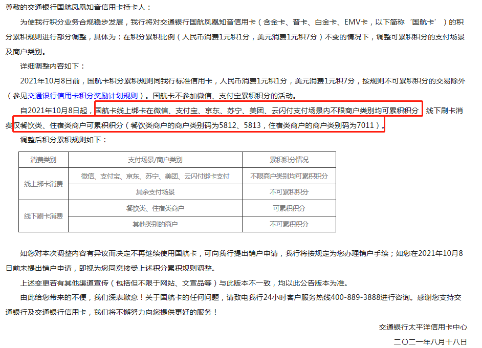 近日,交通银行悄悄发了一则公告。小编看完的第一感受:我擦,居然连交行也开始动手了。 公告不长,为了让朋友看到公告全文,小编截了全貌。不过这使图中的文字回复不清晰。没关系,小编为大家分析如下: 公告是针对国航凤凰知音联名信用卡积分规则的调整,自2021年10月8日起,国航凤凰知音联名信用卡: