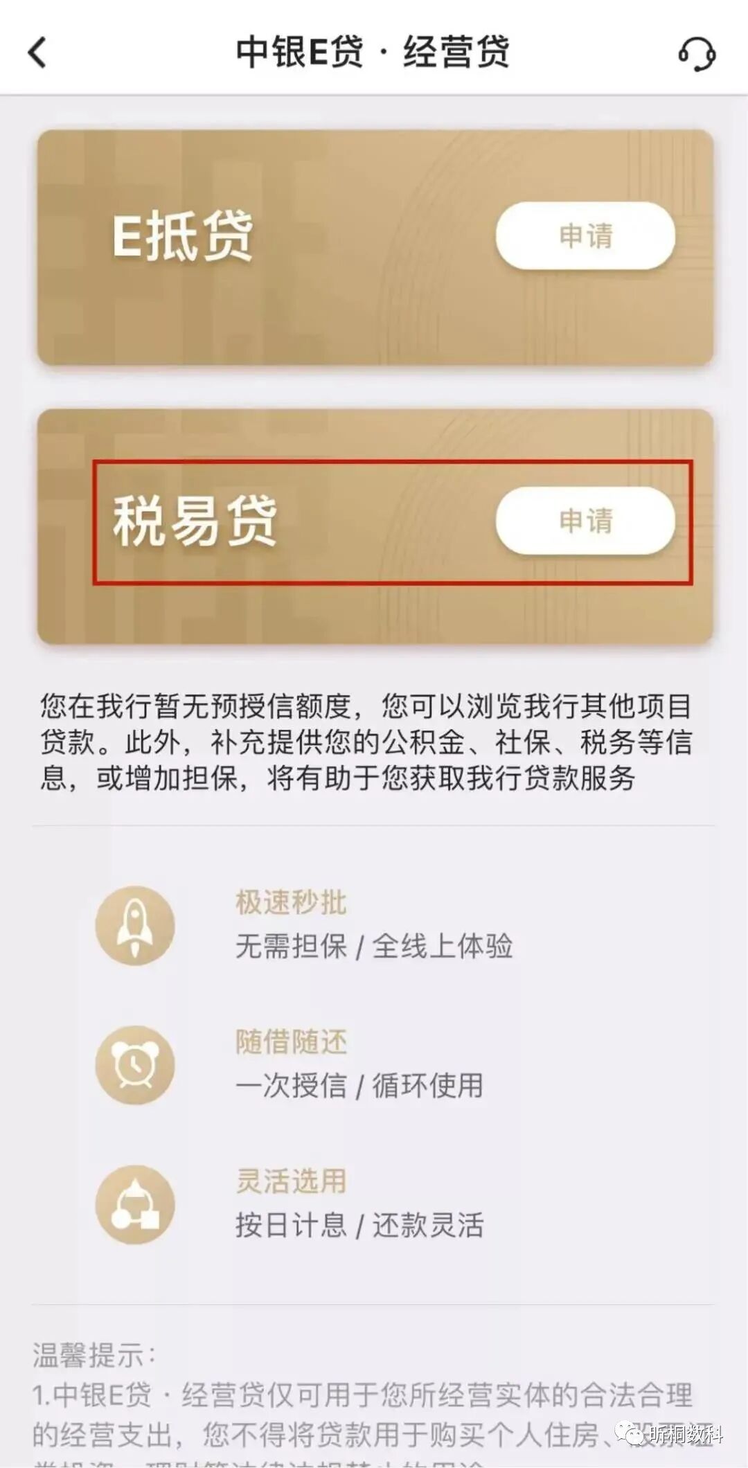 中国银行-税易贷 产品信息 基本属性: 借款额度:最高50万 借款利息:3.85%起 借款期限:一年 还款方式:等额本息,按月付息,到期还本,随借随还 申请条件 申请条件: 1.借款人年龄在18-60周岁。 2.申请人为企业法人或占股不低于30%的大股东,近一年申请人在公司不能有变更。 3.企业注册成立2年以上,正常经营且连续纳税2年以上,年纳税额需在5000元以上,年销售额50万以上,无欠缴税款情况。 4.最近一期纳税信用等级为A/B/M,最好为A/B。 5.信用卡正常使用正常还款,其它个人贷款正常还款。 准入区域 全国 申请流程 申请流程: (一)登录税务局官网进行税局授权 1、客户使用电脑登陆国家税务总局湖北省电子税务局(网址:https://etax.hubei.chinatax.gov.cn/portal/),插入CA证书点击页面右上角“登陆”; 2、点击页面左下角“互联网+银税互动”; 3、选择“中国银行”,点击下一步,点击“确认授权”; 4、输入CA密码,点击确认,授权成功后点击“确定”。 (二)登录中国银行手机银行,在线申请贷款 申请步骤:登陆中国银行手机银行,点击【贷款】→【中银E贷·经营贷】→【税易贷】,填写申请信息、企业信息、上传营业执照。 (上下滑动阅读更多) (三)专人对接,线下调查 客户手机银行申请后,银行客户经理稍后会与您取得联系,上门核实企业经营情况。 (四)确认额度,线上用款 客户经理线下调查后,再次提交系统进行最终审批,我行将以短信通知告知您最终贷款审批结果。 1、确认额度:如您的贷款通过审核,请您及时登录手机银行确认额度,额度确认操作步骤:登陆中国银行手机银行,点击【贷款】→【中银E贷·经营贷】→【确认额度】,在线签署额度协议。 2、在线用款:点击“用款”,您即可在手机银行随时发起提款,额度有效期内随借随还,按日计息。 税易贷小贴士 1、请您首先去税局做税务数据授权,然后在手机银行发起贷款申请。 2、申请金额填写≤50万元,期限填写≤12个月。 3、企业信息请确保填写准确。 4、如当天审批未通过,次日可重新申请。 5、如显示“审批中”,我行客户经理会及时与您联系。 以上流程为税易贷申请流程,中国银行税易贷开通地区很少,每个地区申请流程有些许差异,具体可咨询当地银行网点客户经理,以当地要求为准。 注意问题: 1.在税务授权时,如果纳税人有多个身份(办税员、财务负责人、法定代表人),则选择法定代表人身份进入。 2.借款金额不高于50万,借款期限不超过12个月。 3.如果当天被拒绝,第二天可以再次申请。 4.提交申请后,如果长期显示“审批中”,业务可能已经转成线下人工办理,联系当地银行网点客户经理办理即可。 5.在填写业务办理网点的时候,选择熟悉的银行营业网点,方便后续服务。 免责申明: 产品信息来源于机构官网/网点/客户经理,或第三方公开信息平台,最终以产品机构发布为准,如产品信息有误或其他异议,联系我修改;图文有些内容来自网络,如果侵权,可联系删除。 了解更多知识,请关注卡神吧,为您提供信用卡、贷款、理财、保险等资讯及交流! 特别声明1、该文观点仅代表作者本人,卡神吧系信息发布平台,卡神吧仅提供信息存储空间服务。 2、您若发现有侵略您著作权行为,请及时告知,我们工作人员将在第一时间删除侵权作品、停止继续传播。 3、如果你喜欢这篇文章,请帮助我们转发它分享给你身边的好友。 |