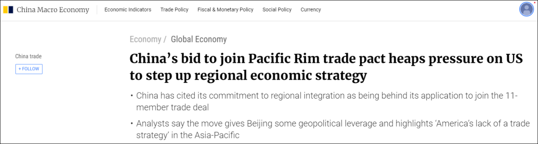据美媒《华尔街日报》当地时间9月17日披露,这一情况的发生,导致主导CPTPP的各个美国盟友于当天(中方递交加入申请次日)进行了一番堪称“尴尬”的商讨(some awkward discussions)。有成员国表示,任何国家都可以申请加入,但也有成员国声称,新来者(中国)可能不适合加入该协定。《华尔街日报》分析称,CPTPP虽事关贸易,但却会牵扯出所谓“地缘政治问题”。而香港《南华早报》则援引分析人士指出,中国申请加入CPTPP也可看作是一种对美国的“施压”,这可能凸显出美国缺乏亚太贸易战略,将是其对华竞争中的“阿喀琉斯之踵”(意为软肋或死穴)。