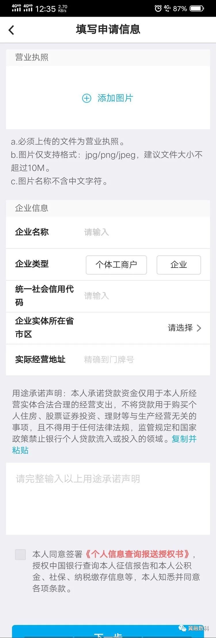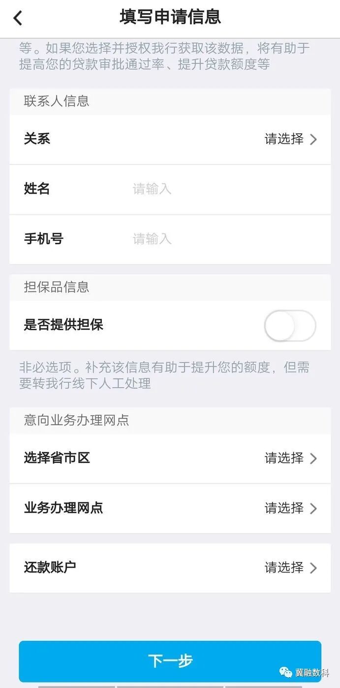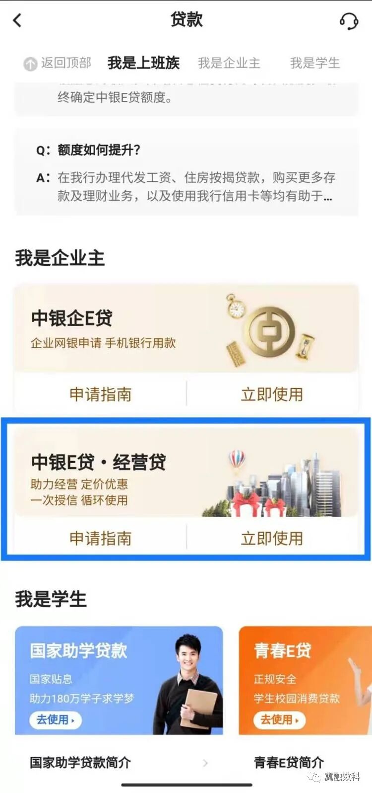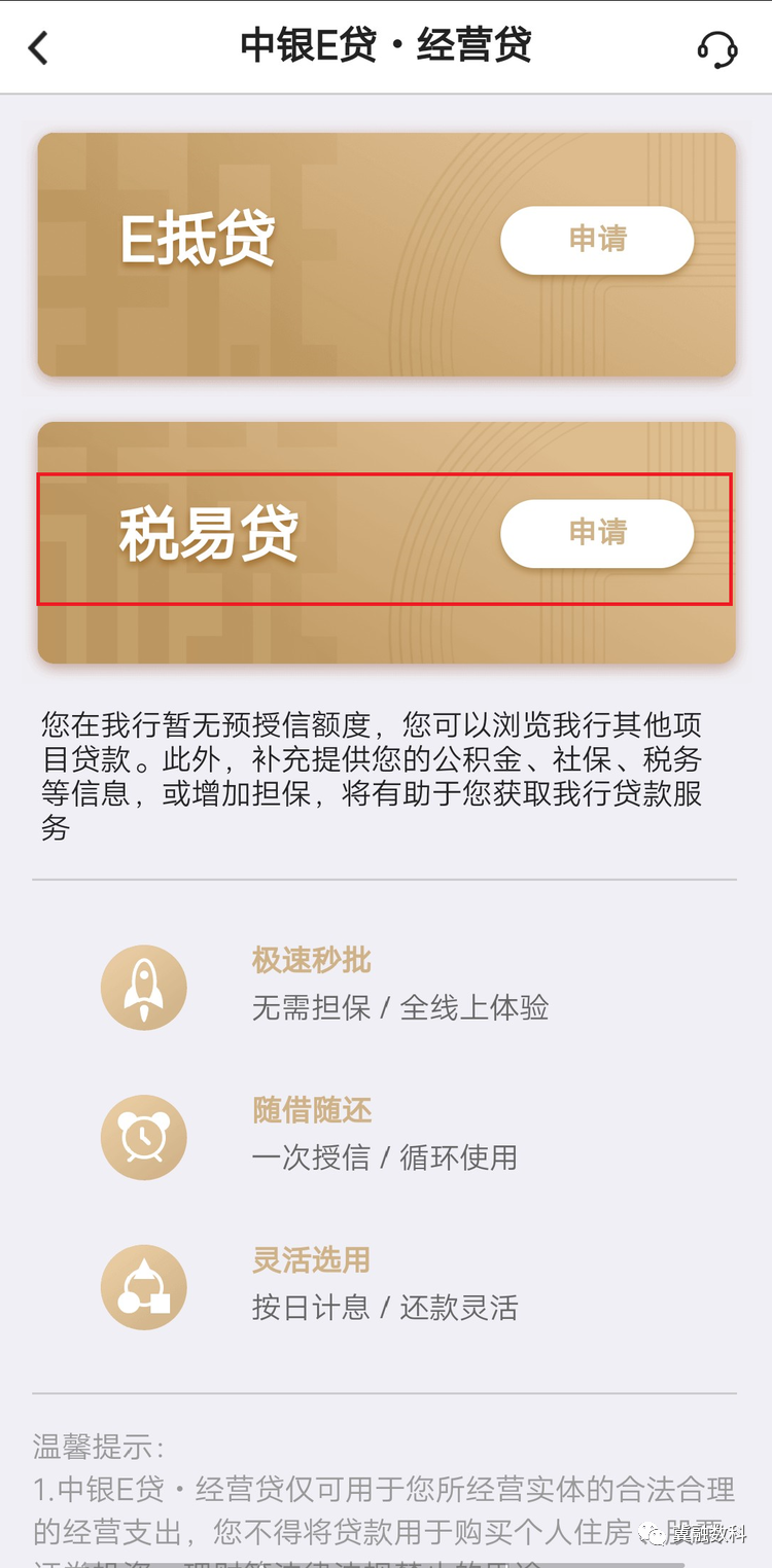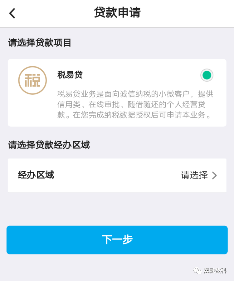 2、登录手机银行,选择“贷款”→“中银E贷 · 经营贷”→“税易贷”,进入申请界面。 3、选择贷款经办区域。 4、填写贷款申请信息。 注意事项: