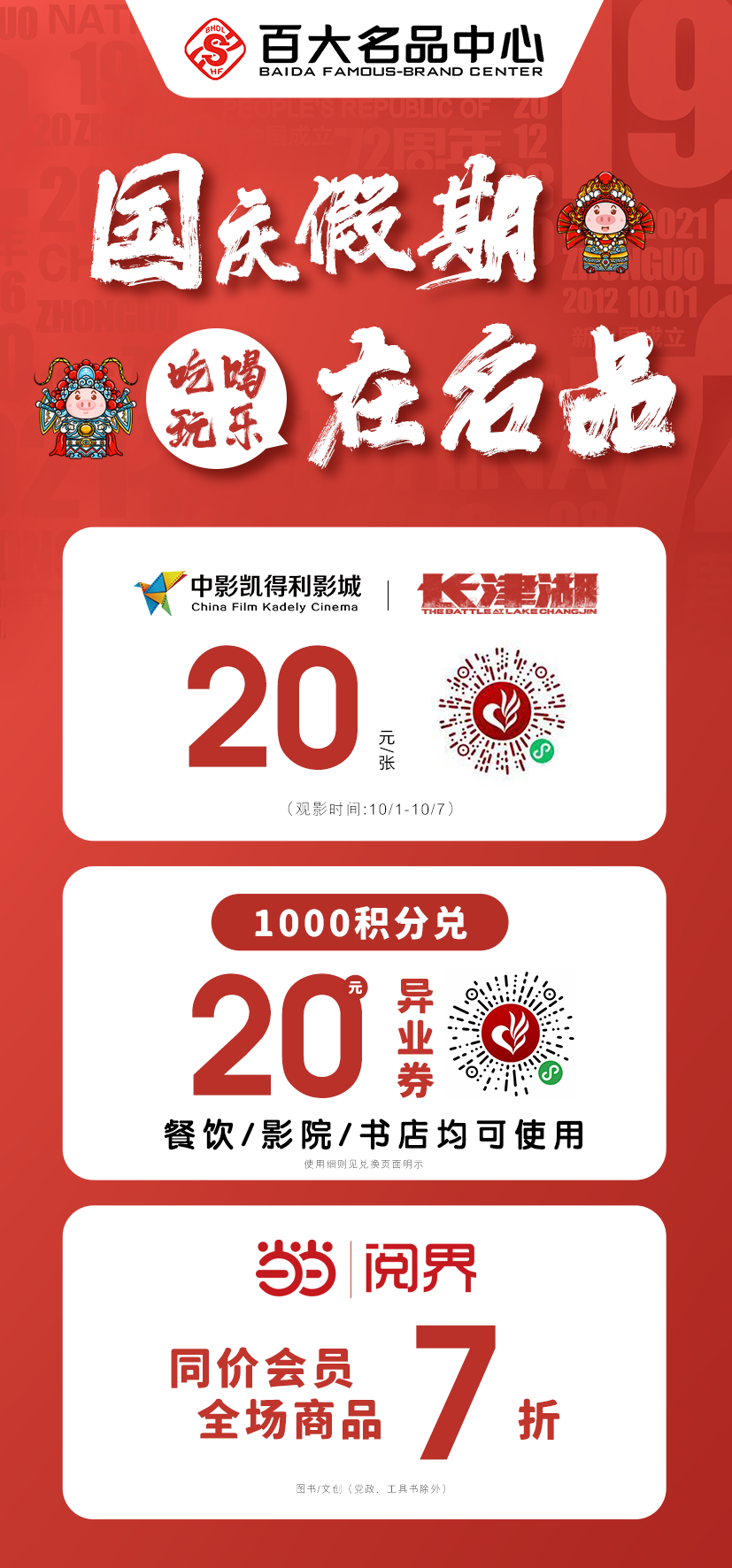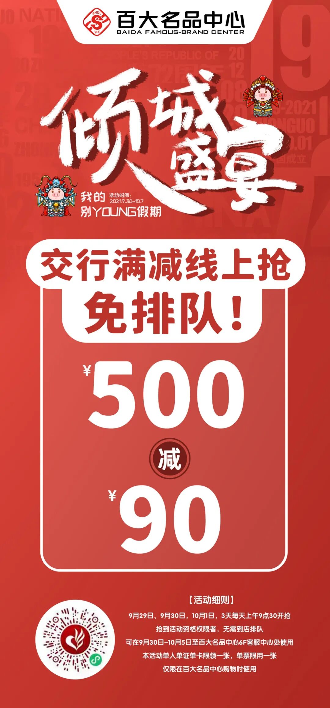 这一不留神啊就到了9月底 还有几天就要到国庆假期啦 大家应该敏锐地嗅到了不一样的气息 小编也忍不住跟大家剧透啦 ? 9月30日-10月7日 百大名品中心倾城盛宴 就要正式开幕啦 每到大型节假日百大名品中心人流量简直堪比线上的双11?尤其是小伙伴们爱的银行刷卡活动蚌埠人民yyds ??♂???♂???♂???♂???♂? 毫无意外地这次国庆小长假银行刷卡又来咯~为了提前给小伙们一个好的购物体验这次交行信用卡满500立减90我们开展了“线上抢刷卡资格”活动免去你排队的烦恼 >9月29日-10月1日每天上午9:30登陆“百大悦购—百大名品中心”抢到刷卡资格权限者无需到店排队>9月30日-10月5日至6F客服中心使用*本单活动单人单卡限领一份,单票限用一张*限在百大名品中心购百货类商品使用 ??? 国庆观影福利来喽扫码下图小程序码 选择“百大名品中心” 《长津湖》电影票20元/张,单人限购2张(数量有限 抢完即止) 如何查询积分: 点击关注百大名品中心官方微信,点击菜单【小程序】-【我的】-积分查询,即可查询会员积分数 3楼商场当当书店! 同价会员 全馆商品7折 图书/文创(党政、工具书除外) 交通银行(9月30日-10月7日) 凡刷交行信用卡,购百货类商品满500减90元 农业银行(9月30日-10月7日) 农业银行信用开卡绑定农行APP,450元购500元。每天早上10点在农行APP上开抢,当天至百大名品中心核销使用 工商银行(9月30日—10月7日) 活动一:凡工行信用卡刷卡消费时,购百货类满500元送100元百大券,数量有限,送完为止。 活动二:用支付宝、微信支付时绑定工行信用卡消费,购百货类可享200购220,数量有限,送完为止。 银联闪付(9月18日-11月17日) 银联闪付100-30(持卡人使用银联手机闪付绑定62开头银联卡,出示银联手机闪付二维码进行支付(苹果手机不支持),可享受满100元立减30元优惠,单用户(单设备、单卡、单手机号)单日可享1次优惠,活动期间限享2次优惠。 邮储银行(10月1日-10月7日) 凡刷邮储银行信用卡,购百货类商品满498减68元 送给你们小 了解更多知识,请关注卡神吧,为您提供信用卡、贷款、理财、保险等资讯及交流! 特别声明1、该文观点仅代表作者本人,卡神吧系信息发布平台,卡神吧仅提供信息存储空间服务。 2、您若发现有侵略您著作权行为,请及时告知,我们工作人员将在第一时间删除侵权作品、停止继续传播。 3、如果你喜欢这篇文章,请帮助我们转发它分享给你身边的好友。 |