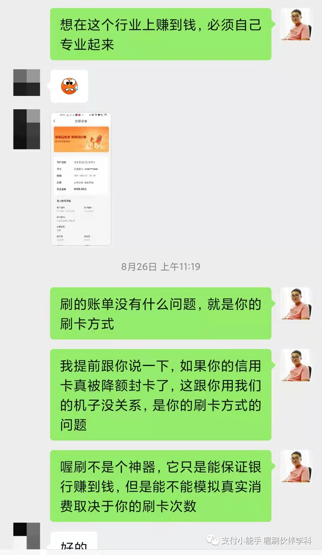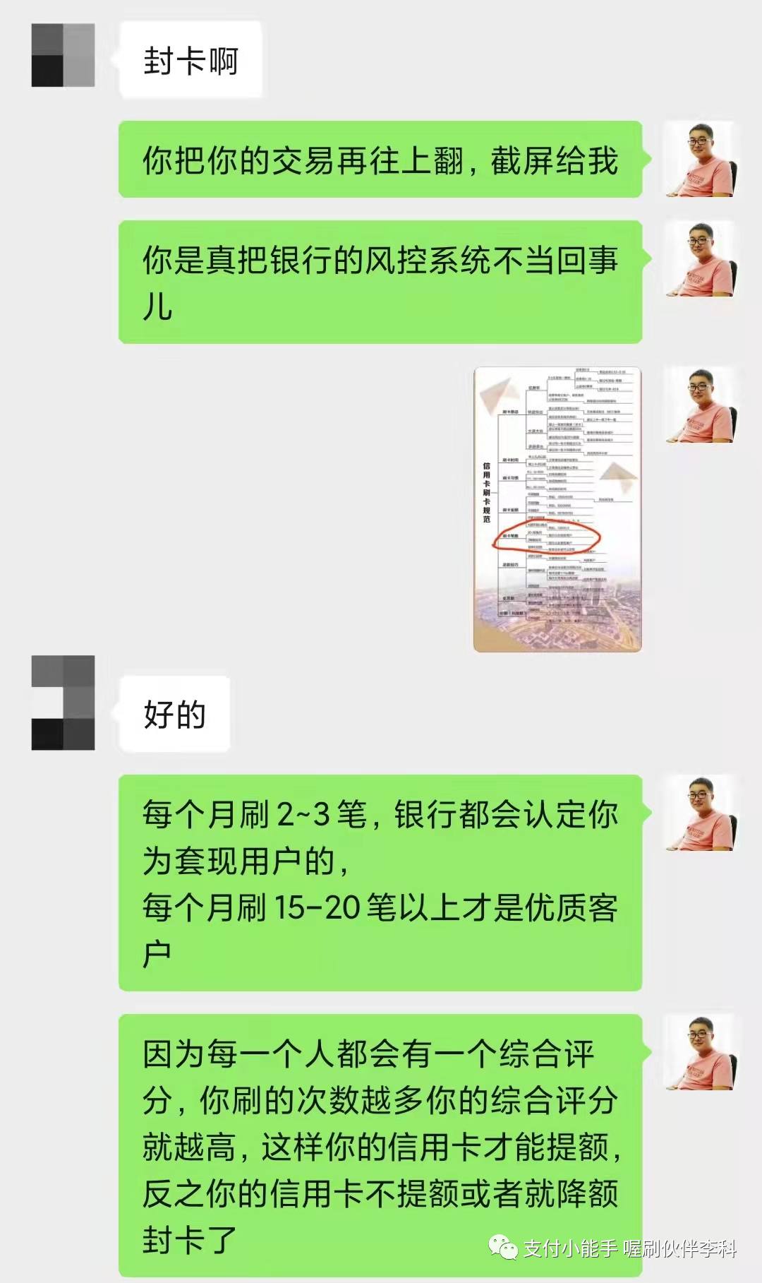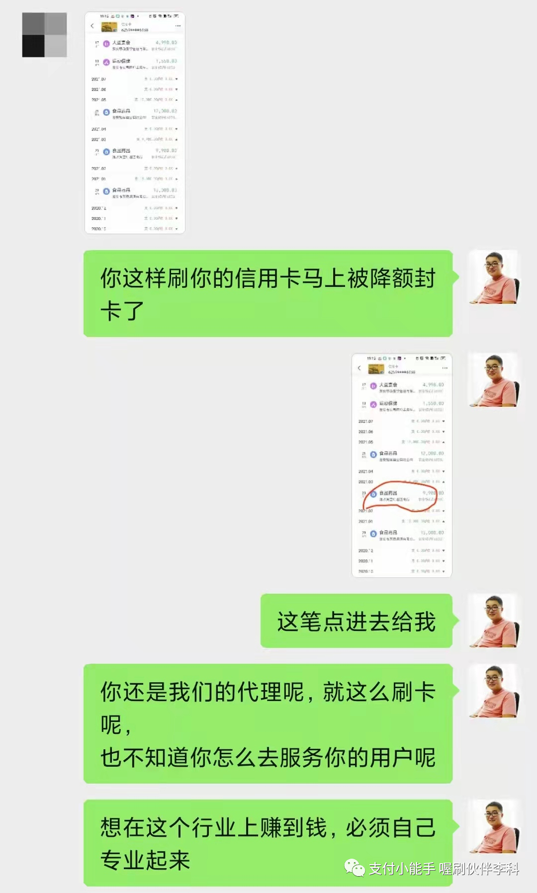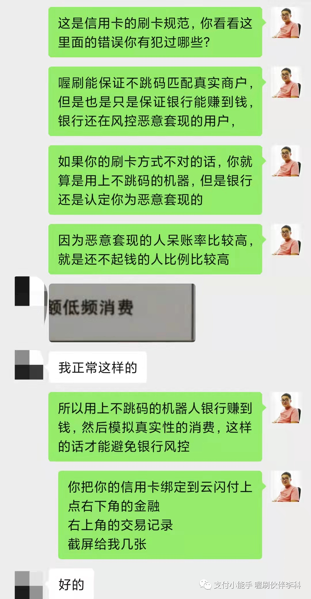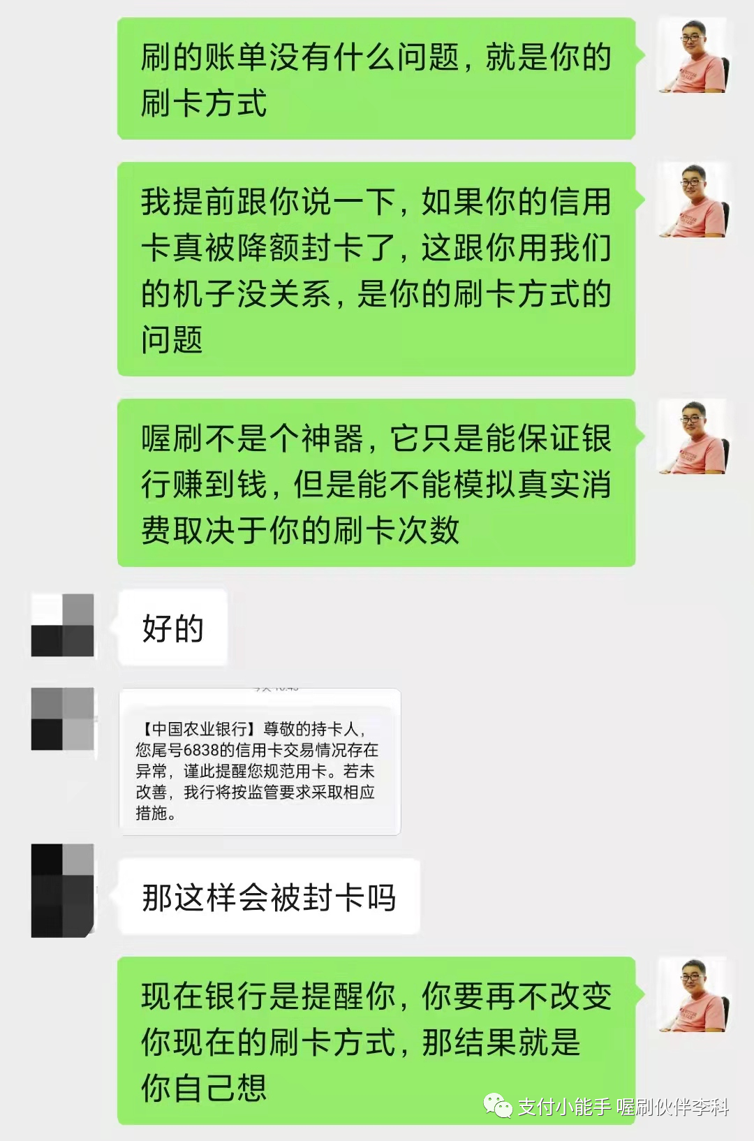 请点击播放下面的音频 大家好,我是李科,我把我遇到的一个案例跟大家进行一个分享, 这是一个不怎么动的五台机器的伙伴的代理,收到了一个短信,短信内容是这样子的, 尊敬的持卡人,中国农业银行发过来的,您的尾号某某信用卡交易情况存在异常,仅此提醒您规范用卡,若未改善我行将按监管要求采取相应措施。 他当时收到这个短信以后呢,给我发了一句话,他说这是什么情况。 我仔细把他的这个短信读了一下, 因为之前我还发过一个朋友圈,也不知道是哪个伙伴整理的中信银行发的这些短信, 有些短信呢,它属于就是群发的,有的它真的是要给你做提醒,我把中信银行的那三个短信找出来。 上图是图一 上图是图二 上图是图三 第一个中信银行说,温馨提示,信用卡仅限于个人日常生活类消费,需通过正常途径刷卡或者取现,取现会产生费用。对于非法pos机套现的违法行为,根据监管要求,银行有权采取降额封卡等措施。 第二个短信的意思是尊敬的用户,根据监管要求,信用卡用卡还款或者个人资信出现异常,银行或采取降低额度、限制用卡等措施,仅此提示规范用卡,按时还款,珍惜信用记录。 第三个短信就比较重要了, 第三个短信是: 中信银行信用卡,尊敬的客户,经监测发现您的信用卡有疑似套现用卡行为,规范用卡银行有权违规用卡,银行有权按监管要求对信用卡采取降低额度、限制用卡等措施,仅此提示规范用卡。 那中信银行收到短信提示是怎么回事儿呢? 短信分为三种, 一种是群发类的, 一种是警告短信, 一种是风控短信。 刚才我们说的第一种和第二种暂时不用管,第三种就是明确的告诉您已经有点危险了, 那当时我们这个伙伴把他的这个短信发过来,我一看这个基本上要么是警告,要么就是到比较严重的了。 然后我就给他说,让你规范刷卡,所以你要注意一下你的刷卡方式了。 他回复我的说,我都是正常使用喔刷的。 我说:大小额配比着刷,不要只刷大或者就在还款日那两天刷卡。 我给他发了信用卡的刷卡规范使用的这些内容, 然后,我说这个是信用卡的一个规范,你看一下里面的错误你有没有犯过哪些, 我说 喔刷能保证不跳码 匹配真实商户,能保证银行能赚到钱,但是银行还会进行风控恶意套现的用户的, 如果你的刷卡方式不对的话,就算你用上不跳码的机器,但是银行还是认定你为恶意套现的, 因为恶意套现的人的呆账率是比较高的,就是还不起钱的人比例比较高,所以银行在风控恶意套现者。 他大概把这个图片看了一下,看完以后他说我是正常, 我是这样正常的,他是一个月一到两笔, 他把那个图片框了一下,就是大额低频的这么刷的, 我说 用上不跳码的机器银行是能赚到钱,模拟真实性的消费,这样的话才能避免银行的风控, 我说你把你的信用卡绑到云闪付上,点右下角的金融右上角的交易记录,截屏给我几张。 他说好的,他把截图给我了,截图给我了以后,先给了第一张, 一个月刷了三笔,两笔是一样的金额4998, 虽然是不同的这个日子刷的,但是刷的金额是一样的, 我说向上滑动再给我几张。 这个时候看他半天没给我回,我就直接把这个4998的这两笔框起来, 我说你一个月就刷了三笔,两笔刷的金额还都是一样的, 他说这样会不会降低额度呢?封卡呢, 我说你把你的交易在往上翻截屏给我, 然后我说你真把银行的风控系统不当回事, 然后把信用卡刷卡规范的这个图片,我框给他了刷卡笔数, 每个月基本上刷完两笔的银行都会认定你为套现客户的。 这个图片我相信很多代理都看过,我说每个月刷个两三笔,银行都会认定你为套现用户的, 你每个月刷个15到20笔才能是优质客户, 因为每一个人都会有一个综合评分,你刷的次数越多,你的综合评分就会越高。 这样的话你的信用卡才能提额,反之你的信用卡不提额,或者就降额封卡了, 他问我绑定到这淘宝算不算刷卡? 我说可以算,但是淘宝消费小额的可以,大额套X不要用信用卡在支付宝上套, 你会发现你用支付宝或者微信的交易,这个在云闪付上是没有的, 因为它走的是网联通道,银行包括国家银联系统它是赚不到一毛钱的, 银行和国家给你发行信用卡的目的是为了赚钱, 所以想提额就多刷卡,不要走网联通道。 他说哦,我知道了, 正常每个月刷十次,多久能提额? 我说这个不一定,要看你的综合评分, 正常的人的话都是两到三个月,如果你现在的综合评分比较低的话,那可能得多刷几个月。 总之呢,就是次数多刷提额就很快, 然后他又把他的截图发给我了, 我看了一下,他是基本上是一个月刷一个月不刷, 我让他把这个账单点进去三笔,有一个月是刷了一万二,一个月刷了九千九,一个月刷了一万五, 我说你把这个点开,要不然我我不知道你怎么刷卡的, 点开吓我一跳,每个月就刷一笔 一万二, 我说你这样刷卡,你的信用卡马上就降额封卡了, 我说你还是我们的代理呢,就这么刷卡,也不知道你怎么去服务顾客呢? 想在这个行业上赚到钱,就必须让自己要专业起来呢,然后我让他随便点一笔进去,我看一下他用的是不是喔刷的机子, 我一看开头是831的,这个是没有问题, 我说你的账单是没有的,就是你的刷卡方式有问题,我提前跟你说一下,如果你的信用卡真被降额封卡了,这跟你用我们的机子是没有关系的,这是你刷卡方式的问题造成的, 喔刷不是个神器,它只能保证银行赚到钱,但是能不能模拟真实消费取决于你的刷卡次数和方式, 