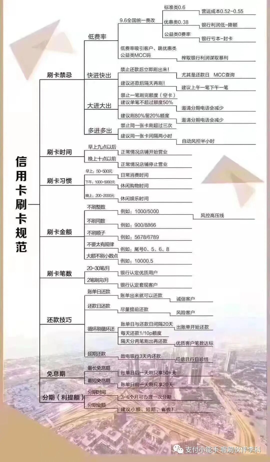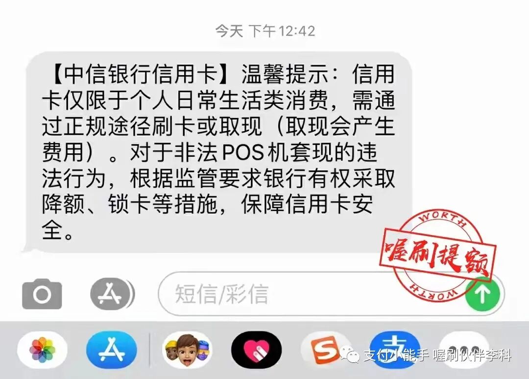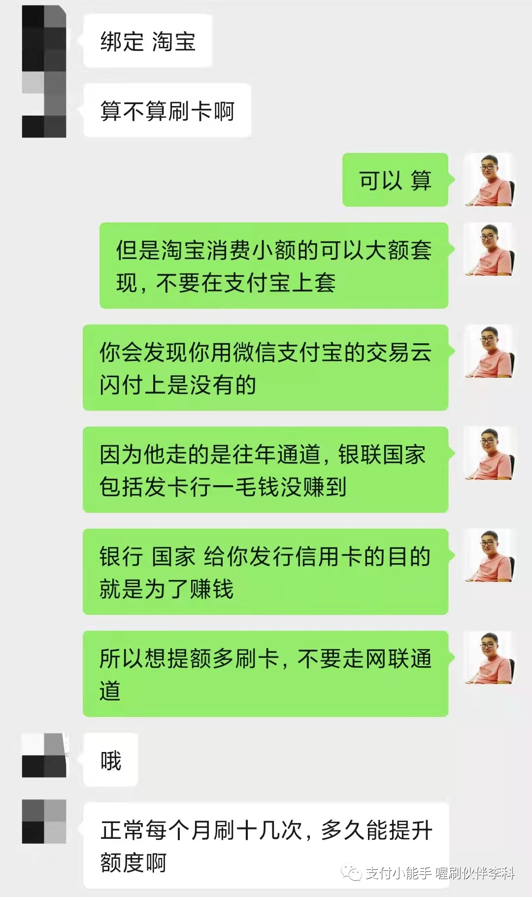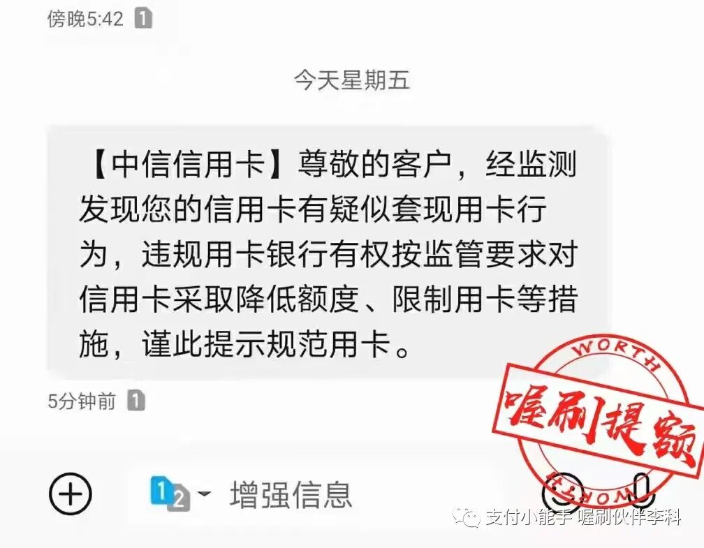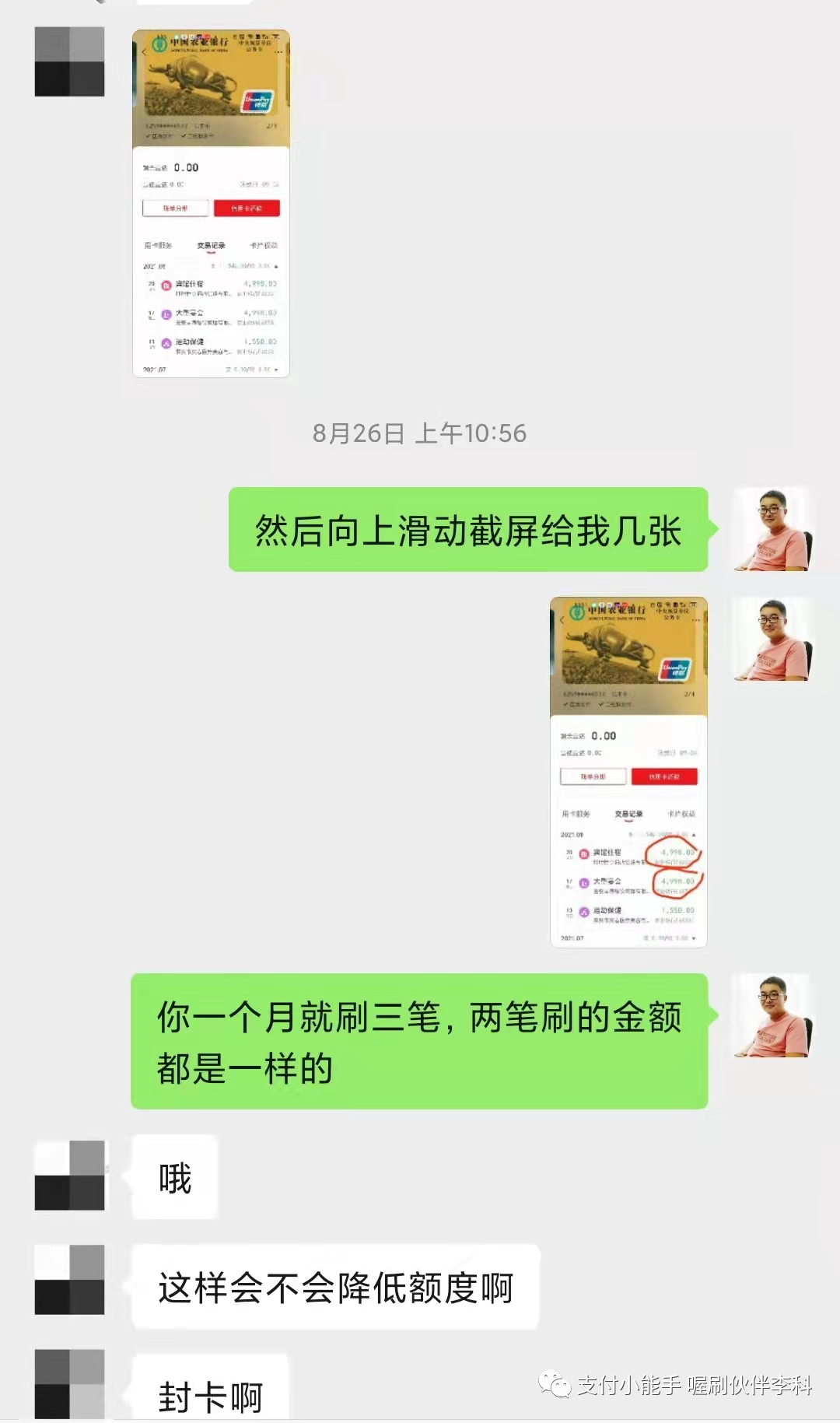 请点击播放下面的音频 大家好,我是李科,我把我遇到的一个案例跟大家进行一个分享, 这是一个不怎么动的五台机器的伙伴的代理,收到了一个短信,短信内容是这样子的, 尊敬的持卡人,中国农业银行发过来的,您的尾号某某信用卡交易情况存在异常,仅此提醒您规范用卡,若未改善我行将按监管要求采取相应措施。 他当时收到这个短信以后呢,给我发了一句话,他说这是什么情况。 我仔细把他的这个短信读了一下, 因为之前我还发过一个朋友圈,也不知道是哪个伙伴整理的中信银行发的这些短信, 有些短信呢,它属于就是群发的,有的它真的是要给你做提醒,我把中信银行的那三个短信找出来。 上图是图一 上图是图二 上图是图三 第一个中信银行说,温馨提示,信用卡仅限于个人日常生活类消费,需通过正常途径刷卡或者取现,取现会产生费用。对于非法pos机套现的违法行为,根据监管要求,银行有权采取降额封卡等措施。 第二个短信的意思是尊敬的用户,根据监管要求,信用卡用卡还款或者个人资信出现异常,银行或采取降低额度、限制用卡等措施,仅此提示规范用卡,按时还款,珍惜信用记录。 第三个短信就比较重要了, 第三个短信是: 中信银行信用卡,尊敬的客户,经监测发现您的信用卡有疑似套现用卡行为,规范用卡银行有权违规用卡,银行有权按监管要求对信用卡采取降低额度、限制用卡等措施,仅此提示规范用卡。 那中信银行收到短信提示是怎么回事儿呢? 短信分为三种, 一种是群发类的, 一种是警告短信, 一种是风控短信。 刚才我们说的第一种和第二种暂时不用管,第三种就是明确的告诉您已经有点危险了, 那当时我们这个伙伴把他的这个短信发过来,我一看这个基本上要么是警告,要么就是到比较严重的了。 然后我就给他说,让你规范刷卡,所以你要注意一下你的刷卡方式了。 他回复我的说,我都是正常使用喔刷的。 我说:大小额配比着刷,不要只刷大或者就在还款日那两天刷卡。 我给他发了信用卡的刷卡规范使用的这些内容, 然后,我说这个是信用卡的一个规范,你看一下里面的错误你有没有犯过哪些, 我说 喔刷能保证不跳码 匹配真实商户,能保证银行能赚到钱,但是银行还会进行风控恶意套现的用户的, 如果你的刷卡方式不对的话,就算你用上不跳码的机器,但是银行还是认定你为恶意套现的, 因为恶意套现的人的呆账率是比较高的,就是还不起钱的人比例比较高,所以银行在风控恶意套现者。 他大概把这个图片看了一下,看完以后他说我是正常, 我是这样正常的,他是一个月一到两笔, 他把那个图片框了一下,就是大额低频的这么刷的, 我说 用上不跳码的机器银行是能赚到钱,模拟真实性的消费,这样的话才能避免银行的风控, 我说你把你的信用卡绑到云闪付上,点右下角的金融右上角的交易记录,截屏给我几张。 他说好的,他把截图给我了,截图给我了以后,先给了第一张, 一个月刷了三笔,两笔是一样的金额4998, 虽然是不同的这个日子刷的,但是刷的金额是一样的, 我说向上滑动再给我几张。 这个时候看他半天没给我回,我就直接把这个4998的这两笔框起来, 我说你一个月就刷了三笔,两笔刷的金额还都是一样的, 他说这样会不会降低额度呢?封卡呢, 我说你把你的交易在往上翻截屏给我, 然后我说你真把银行的风控系统不当回事, 然后把信用卡刷卡规范的这个图片,我框给他了刷卡笔数, 每个月基本上刷完两笔的银行都会认定你为套现客户的。 这个图片我相信很多代理都看过,我说每个月刷个两三笔,银行都会认定你为套现用户的, 你每个月刷个15到20笔才能是优质客户, 因为每一个人都会有一个综合评分,你刷的次数越多,你的综合评分就会越高。 这样的话你的信用卡才能提额,反之你的信用卡不提额,或者就降额封卡了, 他问我绑定到这淘宝算不算刷卡? 我说可以算,但是淘宝消费小额的可以,大额套X不要用信用卡在支付宝上套, 你会发现你用支付宝或者微信的交易,这个在云闪付上是没有的, 因为它走的是网联通道,银行包括国家银联系统它是赚不到一毛钱的, 银行和国家给你发行信用卡的目的是为了赚钱, 所以想提额就多刷卡,不要走网联通道。 他说哦,我知道了, 正常每个月刷十次,多久能提额? 我说这个不一定,要看你的综合评分, 正常的人的话都是两到三个月,如果你现在的综合评分比较低的话,那可能得多刷几个月。 总之呢,就是次数多刷提额就很快, 然后他又把他的截图发给我了, 我看了一下,他是基本上是一个月刷一个月不刷, 我让他把这个账单点进去三笔,有一个月是刷了一万二,一个月刷了九千九,一个月刷了一万五, 我说你把这个点开,要不然我我不知道你怎么刷卡的, 点开吓我一跳,每个月就刷一笔 一万二, 我说你这样刷卡,你的信用卡马上就降额封卡了, 我说你还是我们的代理呢,就这么刷卡,也不知道你怎么去服务顾客呢? 想在这个行业上赚到钱,就必须让自己要专业起来呢,然后我让他随便点一笔进去,我看一下他用的是不是喔刷的机子, 我一看开头是831的,这个是没有问题, 我说你的账单是没有的,就是你的刷卡方式有问题,我提前跟你说一下,如果你的信用卡真被降额封卡了,这跟你用我们的机子是没有关系的,这是你刷卡方式的问题造成的, 喔刷不是个神器,它只能保证银行赚到钱,但是能不能模拟真实消费取决于你的刷卡次数和方式, 