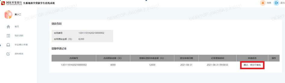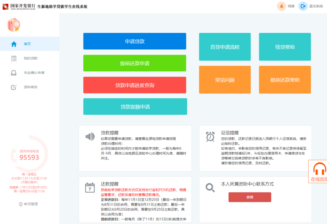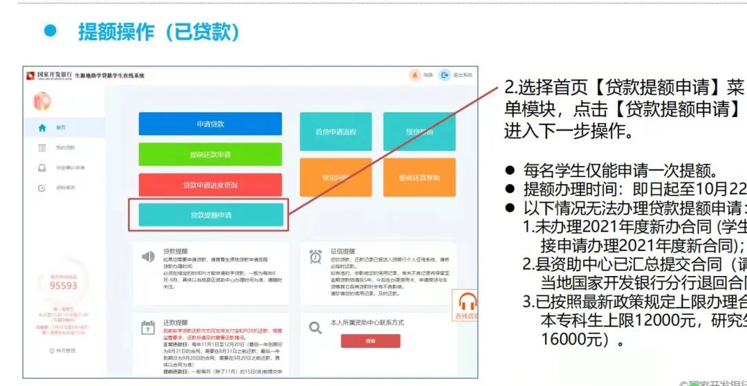 点击蓝字 关注我们 2021年9月29日 星期三 国家开发银行国家助学贷款提额功能介绍 一、政策解读 2021年9月6日,财政部、教育部、人民银行、银保监会联合下发《关于进一步完善国家助学贷款政策的通知》,调整国家助学贷款额度和使用范围: 提升贷款额度:全日制普通本专科学生(含第二学士学位、高职学生、预科生)每人每年申请贷款额度由不超过8000元提高至不超过12000元;全日制研究生每人每年申请贷款额度由不超过12000元提高至不超过16000元。 扩大贷款用途:学生申请的国家助学贷款应优先用于支付在校期间学费和住宿费,超出部分可用于弥补日常生活费。 加强贷款审查:国家助学贷款承办银行要加强贷款及其使用范围审查,合理确定学生助学学贷款金额。 加强贷款审查:国家助学贷款承办银行要加强贷款及其使用范围审查,合理确定学生助学学贷款金额。 二、提额操作 常规操作(未贷款) 我行已在助学贷款系统内调整了可贷款金额参数,系统将根据学生的学历信息,自动提升贷款的上限。对于目前仍未未申请助学贷款的学生,只需在申请时填写需要贷款的金额即可。 1.学生登录我行助学贷款学生在线服务系统(https://sls.cdb.com.cn)。 2.学生通过账户密码或者手机验证码登录系统。 3.学生登录后选择【申请贷款】。 4.学生按照需要填写贷款金额。 可选择贷款金额范围已经调整为“1000-12000”元。 (以本科生为例) 5.按系统提示完成申请。 提额操作(已贷款) 为了让家庭经济困难学生在本学年即可享受到提额的优惠政策,我行针对今年已经办理了助学贷款的学生开发提额功能模块,可以方便学生在线远程实现贷款额度的提升。具体操作如下: 1.学生通过账户密码或者手机验证码登录系统。 手机登录注意事项: 同一个手机号每天发送验证码次数限制在5次,超过次数后,需明天再操作; 验证码收到后,有效期5分钟,过期失效; 验证码收到后,在有效期内,输入次数错误超过3次,验证码失效。 3.若学生名下存在可进行贷款提额申请的合同:点击【贷款提额申请】后会弹出《国家开发银行生源地信用助学贷款额度提升有关说明》,点击【提额申请】按钮进入下一步。 4.申请提额后,系统会展示学生名下贷款合同编号和合同原始金额信息,点击页面下方【提额申请】按钮,将自动进入【贷款提额申请界面】。 5.系统自劢弹出“贷款提额政策提示”,学生阅读后点击【我已完整阅读并充分理解上述政策】,进入贷款提额申请录入页面。 6.学生在贷款提额申请录入页面的【提额后贷款申请金额】文本框内,手动输入“提额金额”。点击下一步,继续提额操作。 注意: 学生输入金额必须为100的整数倍,且大于合同原始金额;本科生、预科生不超过12000,研究生不超过16000。 7.系统弹框展示《国家开发银行生源地信用助学贷款借款合同提额申请单》。学生仔细阅读后,点击【同意本贷款提额申请单的内容,进入人脸识别认证程序】。 注意: 本申请单将作为学生合同的附件,在我行后台数据库内保存。 8.弹框提示:贷款提额申请每个合同仅能申请一次,不允许修改和撤销,学生在确认“提额后贷款申请金额”填写无误后,再点击【确认】按钮。 9.系统展示人脸识别授权书《信息查询不使用授权书》,学生阅读后点击【同意】按钮。 10.系统生成人脸识别二维码。学生需使用本人手机支付宝APP扫描二维码,进入助学贷款支付宝人脸识别程序。学生扫码后,自动跳转国家开发银行生源地助学贷款实人认证专用通道。 注意: 该二维码的有效时间为30分钟。 该二维码仅限本人扫码使用,不可分享他人扫码。 11.学生扫码后,在支付宝手机APP内完成人脸识别相关操作。认证成功后,提示用户认证成功。 注意: 每一个二维码对应一次认证机会,认证通过/失败后二维码失效;失败后可再次申请并生成新的二维码。 12.在手机支付宝账户端完成身份认证后,返回我行学生在线系统,点击【我已完成身份认证,点击查询】按钮。 13.系统弹出身份认证结果,点击【确认】。 14.系统生成《国家开发银行生源地信用助学贷款借款合同提额电子批单》,学生点击【关闭】按钮,完成贷款提额申请操作。 三、提额进度查询 1.在【我的贷款】页签中,已完成提额申请(认证成功)的合同显示为“审批中”。 2.如果需要查询合同提额申请记录,可点击首页的【贷款提额申请】菜单模块,认证成功的合同申请状态为“通过,待分行审批”。 3.提额审批通过后,贷款状态会在首页的“申请进度”中展示为“审批通过(待发放)”。 四、常见问题 1.提额申请需要到县级资助中心现场办理吗? 不需要。 按上述介绍,在线申请办理即可。 2.提额申请提交后,还需要重新签订助学贷款借款合同吗? 不需要。 提额申请单将作为学生2021年助学贷款合同的附件,不合同享有同等法律效力,无需重新签订合同。 3.已经签订助学贷款合同,且学校已经录入了电子回执,还能申请提额吗? 可以。 凡2021年签订助学贷款合同的学生,无论就读的学校是否已录入电子回执,都可以申请一次提额。 4.已经按新限额申请的合同能不能申请提额? 可以。 比如说,某本科生已经于今年9月14日申请了10000元的助学贷款,后由于住宿费增加,需要多申请2000元,仍然可以通过提额功能,申请12000元的助学贷款。但提额只能操作一次,且操作后无法变更。 五、其他工作 县级资助中心 1