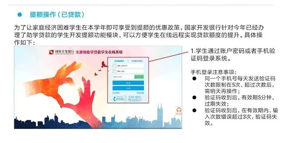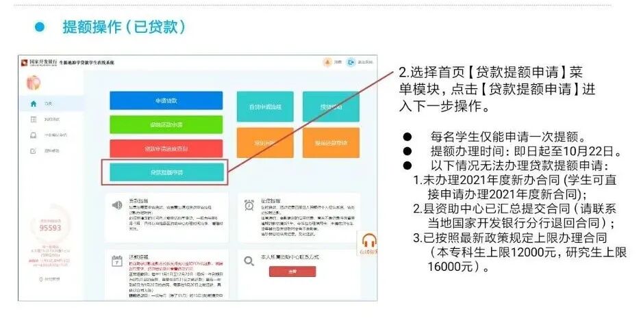 生源地信用助学贷款提额啦! 最新政策 2021年9月6日,财政部、教育部、人民银行、银保监会联合下发《关于进一步完善国家助学贷款政策的通知》,调整国家助学贷款额度和使用范围: 提升贷款额度:全日制普通本专科学生(含第二学士学位、高职学生、预科生)每人每年申请贷款额度由不超过8000元提高至不超过12000元;全日制研究生每人每年申请贷款额度由不超过12000元提高至不超过16000元。 贷款用途 学生申请的国家助学贷款应优先用于支付在校期间学费和住宿费,超出部分可用于弥补日常生活费。 提额操作 提额进度查询 常见问题 1、已经签订助学贷款合同, 且学校已经录入了电子回执,还能申请提额吗? 可以,凡2021年签订助学贷款合同的学生,无论就读的学校是否已录入电子回执,都可以申请一次提额。 2、已经按新限额申请的合同能不能申请提额? 可以,比如说,某本科生已经于今年9月14日申请了10000元的助学贷款,后由于住宿费增加,需要多申请2000元,仍然可以通过提额功能,申请12000元的助学贷款。但提额只能操作一次,且操作后无法变更。 注意事项 国家开发银行将通过短信方式,通知借款学生和共同借款人(即学生家长) ,学生应与共同借款人就提高贷款金额事宜充分沟通并达成一致意 见后,再提交提额申请。如果学生提交了提额申请,国家开发银行将视为学生已就提额事宜与共同借款人达成了一致意见。 本次提额工作无需缴纳任何费用,国家开发银行不会以生源地信用助学贷款提额申请为由,附加不合理条件、要求转账汇款或索取个人信息。 学生在提交提额申请的同时,将对贷款资金使用进行补充的承诺与约定,包括:合理确定助学贷款申请金额,贷款超出学费、住宿费的部分用于日常生活费支出,承诺做到勤俭节约、合理消费,并且授权国家开发银行可以对助学贷款的使用进行必要的管理,以确保资金用于指定用途等。 望同学们树立正确的消费观和价值观,提高勤俭节约的意识;增强学生的社会责任感,努力向学、学以致用,增强就业和报效国家、服务社会能力。 编/大通社记者 农清媛 来源/学生工作部(处) 审核/黄宏春 莫军 邓文来 陆冬梅 往期回顾 新生视界|原来你是这样的YMUN 孟晚舟回国:她的背后,是强大的祖国! 大通社拍了拍你,对面的萌新看过来 了解更多知识,请关注卡神吧,为您提供信用卡、贷款、理财、保险等资讯及交流! 特别声明1、该文观点仅代表作者本人,卡神吧系信息发布平台,卡神吧仅提供信息存储空间服务。 2、您若发现有侵略您著作权行为,请及时告知,我们工作人员将在第一时间删除侵权作品、停止继续传播。 3、如果你喜欢这篇文章,请帮助我们转发它分享给你身边的好友。 |