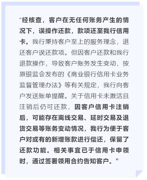 很多持卡人都有过注销信用卡的经历。 注销信用卡看似简单, 有人却因为操作不当, 5年前注销的信用卡 5年后又收到了银行寄来的信用卡账单。 广东东莞的赵先生 在2015年12月, 通过手机银行 申办了一张招商银行的信用卡, 因额度太小只有5000元, 他未激活 当月通过电话客服申办了销户。 没想到,时过5年, 他却莫名其妙收到招行信用卡账单。 今年1月, 赵先生收到招商银行信用卡账单, 显示-0.5元。 早就销了户的卡 怎么还会“活”了过来? 于是他立刻 联系了招行信用卡中心 客服解释说, 这不影响征信, 于是赵先生就没有再追究。 谁知,此后的4月、5月、6月和8月,赵先生又接连收到信用卡账单。分别为-1.5元、0元、-2.1元、0元。 于是赵先生多次向招行反映该问题,客服却告诉他, 在他的名下 还有个隐藏的信用卡账户, 虽然5年前已销户,但可正常还款存款,销户不等于关闭, 只是停用了消费支出功能, 还保留着入账还款功能, 因为赵先生误还资金进去,从而激活了隐藏的信用卡功能。 8月12日, 赵先生曾在东莞阳光热线问政平台 反映过此事。 招商银行官方回复显示: 得知事情原委后, 赵先生非常不满, 担心影响自己的征信。 他还查找了相关规定, 根据银监会 《商业银行信用卡业务监督管理办法》 第四章第四十九条规定: 赵先生认为, 自己并未收到卡片, 从未激活过卡 并且当年已销户, 招行信用卡中心擅自激活开通了账户, 违反了银监会规定。 赵先生为此事前后奔波了几个月, 并向东莞银保监局、上海银保监局 投诉过此事, 要求招商银行信用卡中心 关闭其信用卡入账功能, 并补偿一个月维权损失的误工费和电话费。 经过上海银行业保险业 纠纷调解中心两次调解, 招商银行仅同意 对其隐藏账户的入账功能 做出断网处理, 其他要求不予受理。 赵先生说, 招行还要求他签署 保密协议和责任后果声明, 不签署无法处理。 赵先生无法接受 于是决定向法院提起诉讼 等待法院的最终判决。 信用卡已经是我们日常所需, 现在我们每个人手中多少都会有几张信用卡, 由于卡比较多, 可能会出现销卡的情况, 如果你也想注销掉多余的卡, 一定要注意以下几个问题。 首先,在注销之前应先确认一下年费减免情况,适当存入一部分钱,用来抵消可能的费用。注销之后的信用卡不能随便丢弃,要将磁条剪碎之后再扔掉,以免被他人盗刷。 其次,存在信用卡逾期的朋友,千万不要认为注销信用卡就可以抹去不良信用记录,如果在这个时候注销,那么记录就会永久存在。所以有逾期的朋友,需要继续使用,只要超过24个月不逾期,那么系统就会覆盖前期的记录。 第三,银行在收到销卡请求之后,会查实卡片是否存在债务问题,如果执卡人在销卡的时候,没有达到完整的账单周期,那么其实之前的欠款还清,那么本周期内的账单出账还需要确认,所以确认需要一个周期。 第四,销卡周期,银行一般需要45天左右才能注销成功,在这期间,磁条上的信息还在,如果被不法人员利用就会产生盗刷的危险。 最后,销卡不等于销户,如果确定不再使用,最好同时销户。因为依据规定,银行账户信息自交易记账当年计起至少会保存五年。换一种说法,办理信用卡只是账户的表现形式,销卡并不等于销户。如果只办理销卡,那么如果下次再申请同一家银行的信用卡,就无法享受新客户待遇及优惠,销户则可以避免这一问题。 总之,我们要牢记注销信用卡的正确姿势:先确认年费减免情况,然后存入一部分钱,十几二十即可,以抵消可能发生的费用。注销后45天,拨打银行客服电话,确认是否注销成功,以免因为特殊原因没有注销成功,而给自己留下不良记录。 END 来源:极目新闻(刘闪) 编辑:小土方 推荐阅读 点分享 点赞 点在看 了解更多知识,请关注卡神吧,为您提供信用卡、贷款、理财、保险等资讯及交流! 特别声明1、该文观点仅代表作者本人,卡神吧系信息发布平台,卡神吧仅提供信息存储空间服务。 2、您若发现有侵略您著作权行为,请及时告知,我们工作人员将在第一时间删除侵权作品、停止继续传播。 3、如果你喜欢这篇文章,请帮助我们转发它分享给你身边的好友。 |