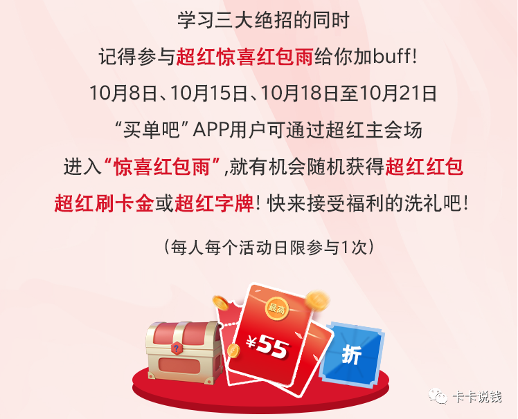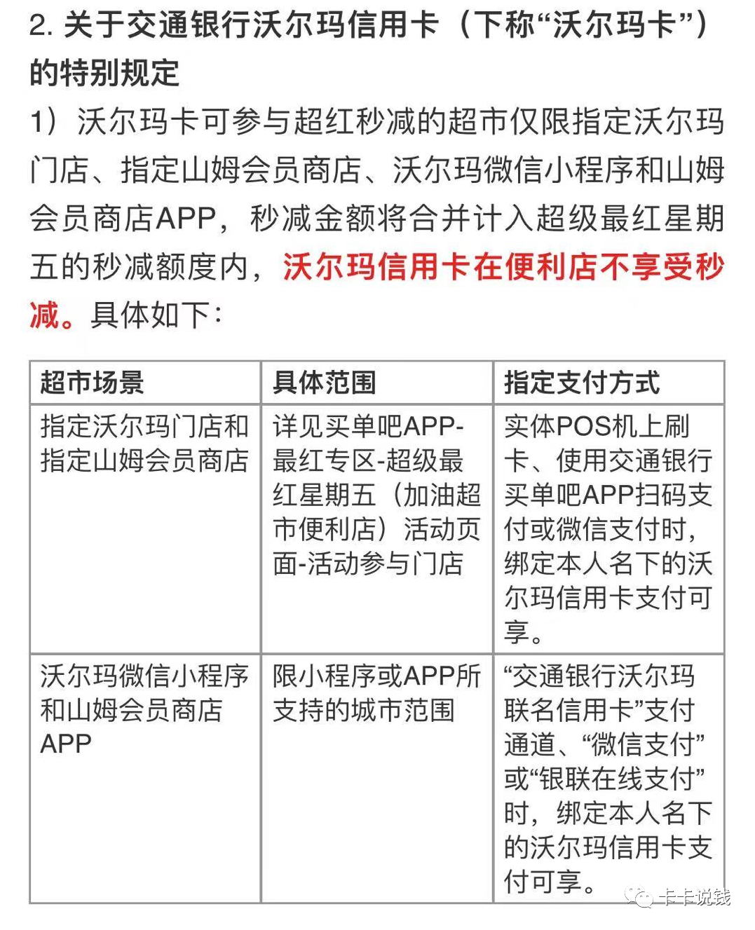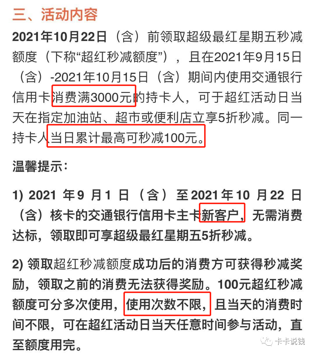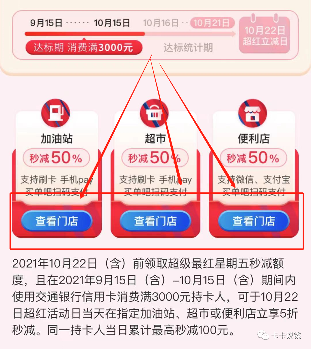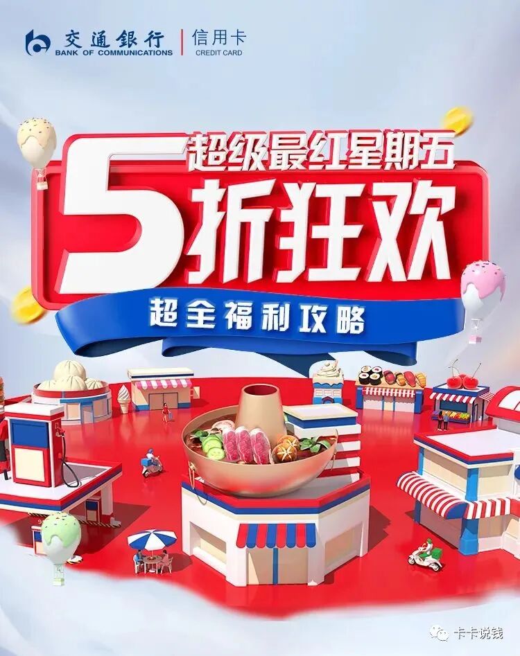 上个月,既明给大家介绍过交行超级最红星期五就要来了,不过时间还长,很多卡友也就没在意。 现在,好消息告诉大家,一年两度的交行超级最红星期五,下周就来了,超红算得上是交行一年里面活动力度最大的存在,定位相当于招行十元风暴(不过交行超红玩法没那么复杂、奖励也没那么多)。 今天是周五,交行最红星期五可以参加,下周就是超级最红星期五,很多奖励都翻倍了,必须参加。 既明算了一下,全部参加保底能拿到325元羊毛,还不算红包雨不稳定的收益。 这里需要重点提醒一下,其中的餐饮加油便利店满减50%的优惠需要在10月15日之前刷卡满3000元,今天是最后一天,还没达标的赶紧去! 大家可以先去买单吧APP超级最红星期五页面看看自己的刷卡达标情况,不够的赶紧去,接下来既明说一下详细玩法。 超级最红星期五主要包括加油站、超市、便利店秒减50%;餐饮券5折两张;加油外卖鲜花5折秒杀、红包雨、开盲盒等等活动。 活动看上去很多,眼花缭乱,别急既明一个一个给您说。 一、5折秒减 这是最主要的活动,也是最值得参加的活动,10月22日当天在指定加油站、超市、便利店消费可以享受5折秒减,每人最多100元额度,相当于消费200元实际只要100元。 这个活动需要10月15日之前刷卡满3000元,还没刷满的赶紧去检查一下,今天是最后一天。 另外,活动需要去指定参加活动的加油站、超市、便利店才能参加,在买单吧活动页面点击查看活动商户即可看到全部参加活动的商户,避免反撸。 参与建议: 1、最值得参加的活动,建议必参加; 2、简单的刚需可以去超市或者便利店买自己需要的东西即可; 3、加油也可以,另外如果暂时没有刚需也可以带加油卡直接去加油站充油卡即可,既明亲测可以满减,有的加油站还有工作人员教你如何使用参加超红满减; 4、原则上超市买购物卡不可以,但是实测不少超市收银员也不管,也能买购物卡正常付款享受满减。 除了以上常规操作,还有一个大BUG! 京东PLUS卡在京东买实物商品也能享受50%秒减,买实体京东卡也是可以的,这样就能做到买200元京东卡秒减100元,实际100元搞定200元京东卡。 切记一定要通过京东支付选择京东PLUS卡,跳转微信支付或者其他方式是不行的。 别去问客服,免得又黄了! 另外沃尔玛卡在便利店不享受秒减,但是可以在沃尔玛门店、山姆会员店、沃尔玛小程序和山姆会员店APP参加,那你懂的。 一定要记得使用能够参加活动的支付方式。 如果你觉得复杂记不住,那就使用交行买单吧APP扫码支付即可,三种场景都支持,肯定不会出错。 再放上一些其他需要注意的细节。 1、9月15日到10月15日内消费满3000,还没刷满的赶紧去; 2、当日最高100元额度,超市、加油站、便利店共享; 3、没有次数限制,可以分多次使用; 4、没有时间限制,只要10月22日当天即可; 5、新户没有刷卡3000元的要求。 最后,一定要注意在指定活动商户参加才行,避免反撸。 指定活动商户可以在买单吧APP看到,还有一些商户黑名单无法参加,估计这些商户之前联合黄牛撸了大量超红/最红满减,被拉黑了哈哈。 以上,就是主要重头戏满减的活动玩法,记得参加。 另外还有其他活动。 二、5折餐饮券 这个活动仅限刚需,平时最红星期五可以买一张,50元买100元,一个月最多2张。 超红当天,不限量购买5折券,每人两张,可以在10月22日到10月24日购买使用,还能叠加超红红包。 刚需必须上,没有刚需既明创造刚需也要上,毕竟民以食为天,都要吃饭啊~ 这个活动能省100元,且没有消费达标要求。 三、5折秒杀 10月22日当天,可以在买单吧APP享受“一键加油”、卖和生鲜鲜花三个场景5折满减。 这个活动无需消费达标,但是数量有限需要抢。 本活动一共包含三部分: 1、一键加油: 上午8点开始,满100-50元,加油站消费或者争当冤大头的团油参加,名额1万,每人一次; 2、外卖到家: 上午9点半开始,满50减25元,买单吧APP饿了么板块直接下单即可,名额10万,每人一次; 3、生鲜鲜花: 上午9点半开始,满100减50元,本来生活、叮咚买菜、蛋糕叔叔、花加等渠道下单,这个竞争最小,参加的人不多,名额3万,每人一次。 以上三个活动,可以拿到100+50*2+50+50+25,一共325元优惠。 新户更多。 四、红包雨 活动开始很久了,每天参加游戏开红包雨,但是基本都是字牌,集齐字牌可以开盲盒。 今天10月15,既明抽到的还是字牌,也没有红包。 不知道10月18、10月21有没有放水,以及集齐字牌的盲盒是啥奖励。 以上,今年下半年超级最红星期五详细玩法,没刷卡的赶紧去,下周记得参加。 另外,昨天交行公告刷屏了。 根据最新公告,交行拟发行两张交通银行美国运通超高端信用卡产品,根据产品等级、功能和服务内容对两张卡产品项下的“年费”收费标准为:其中一张卡产品核发主卡即收取年费3,600元/年/卡,核发附属卡即收取年费1,800元/年/卡;另一张卡产品核发主卡即收取年费36,000元/年/卡,核发附属卡即收取年费18,000元/年/卡。 既明推测,如果是蓝盒子,则是AE白和AE超白,大家可以参考浦发;如果是百夫长,则是百夫长白金和百夫长黑金,大家可以参考招商。 详见此文:突发利好!新出两张卡,媲美AE超白、百夫长黑金,高端阵营大盘点! 至于交行现在选择什么卡好? 去年最佳选择是5倍积分红牛卡,现在红牛卡下线了最佳选择变成了3倍积分王者荣耀卡。 这张卡的主要亮点在于:1、新户能拿到800元的真金白银;2、老户也能拿到100元话