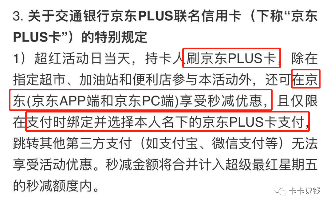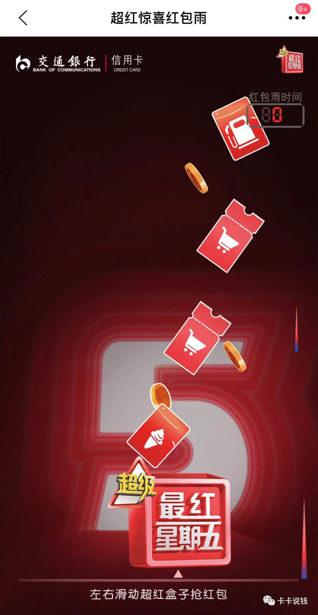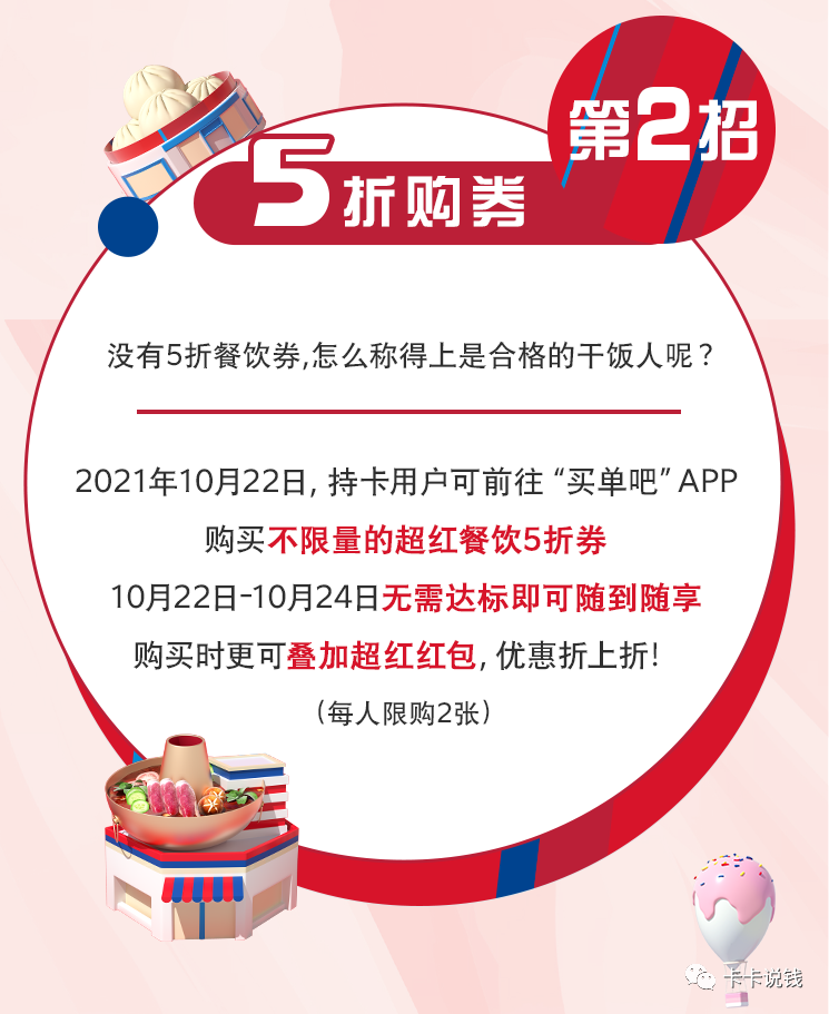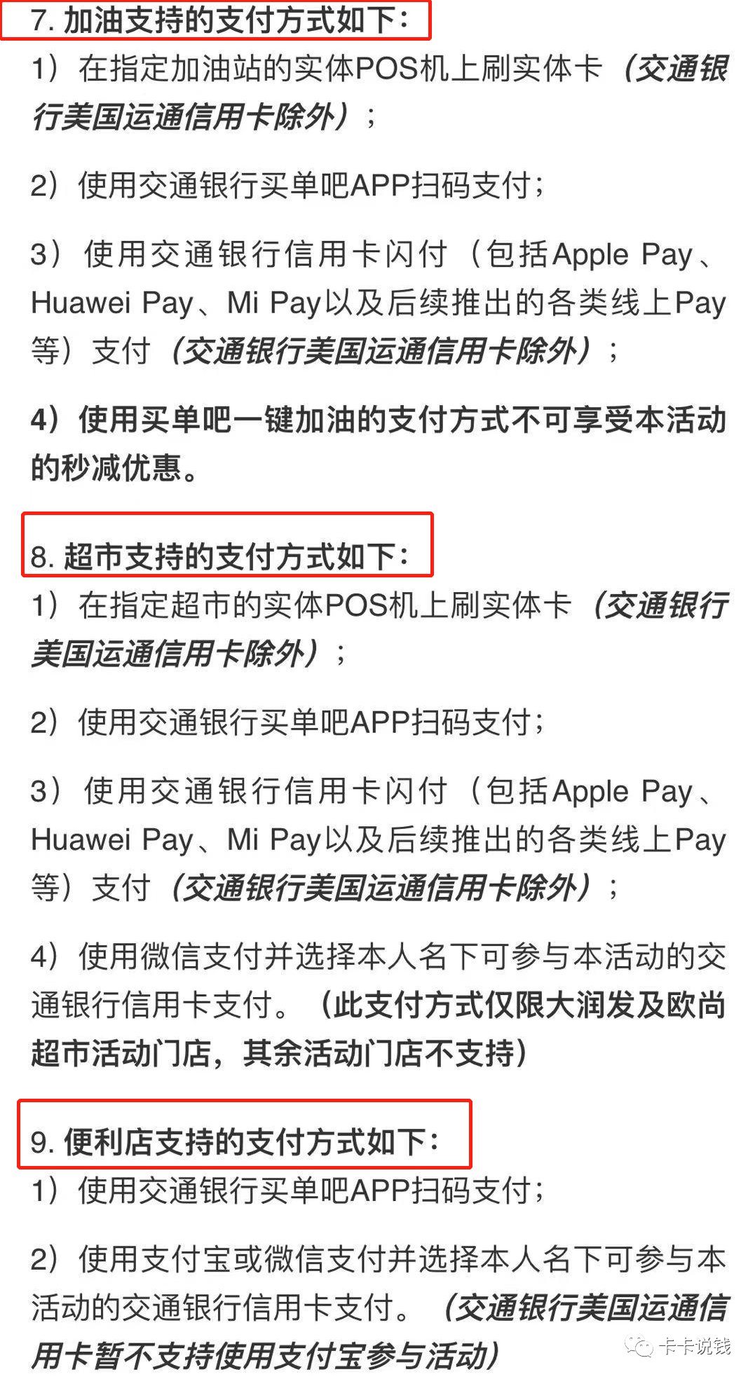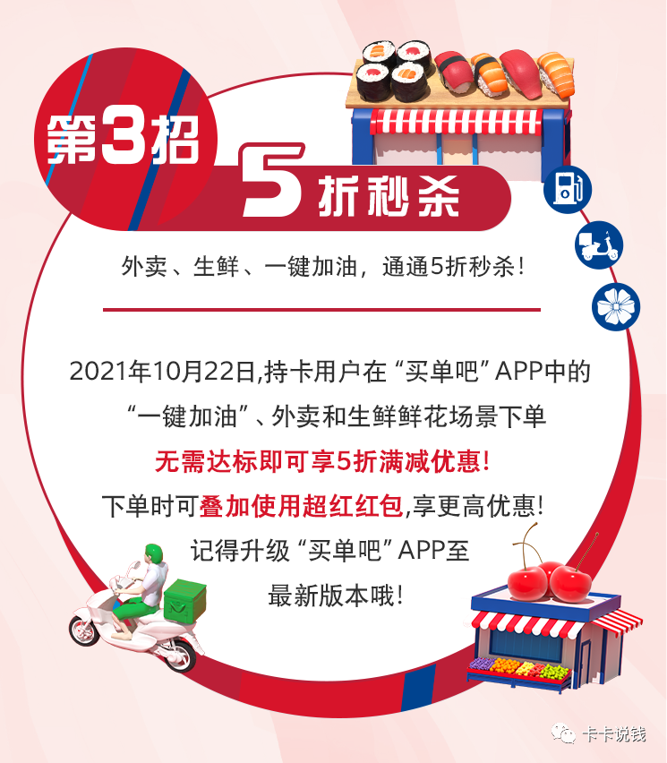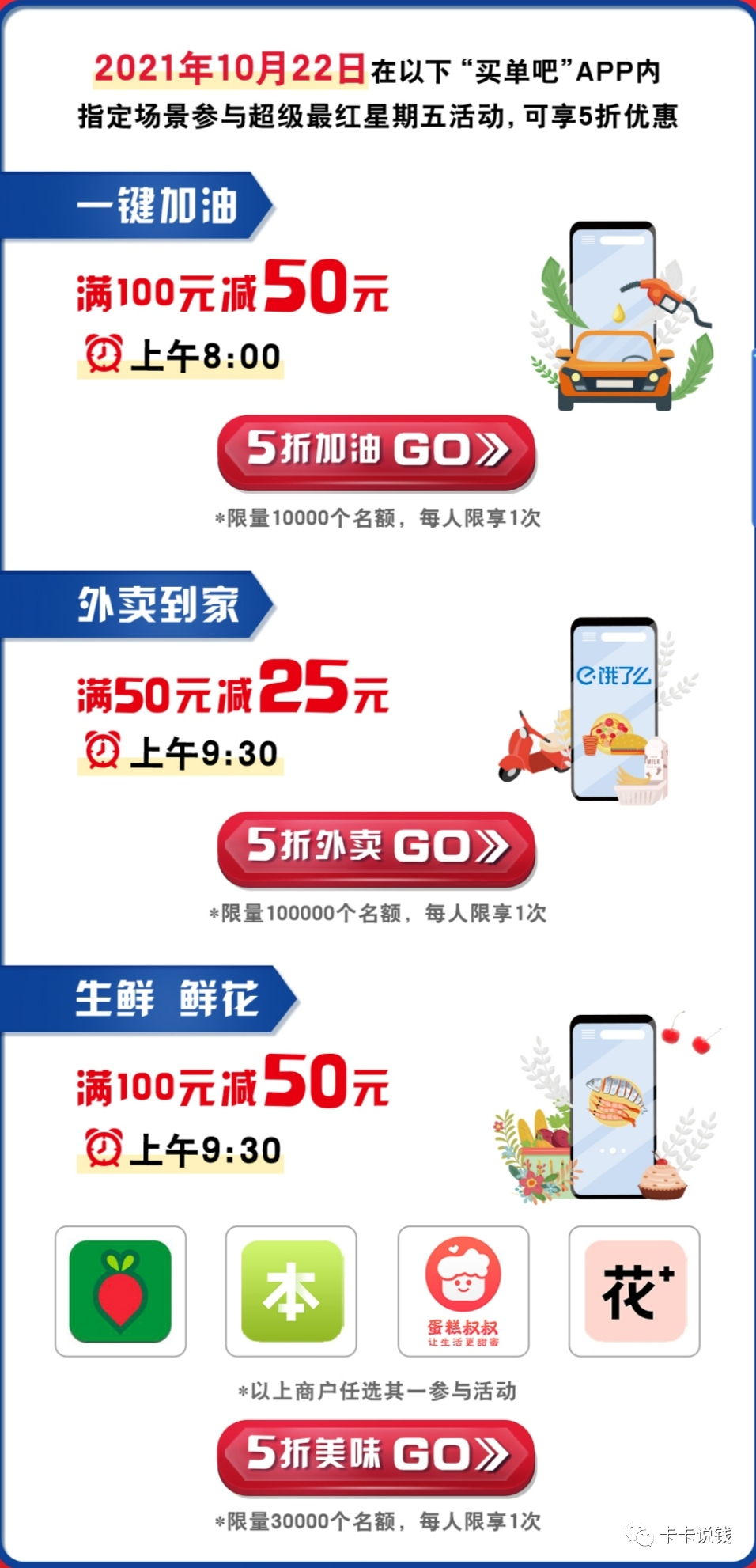 上个月,既明给大家介绍过交行超级最红星期五就要来了,不过时间还长,很多卡友也就没在意。 现在,好消息告诉大家,一年两度的交行超级最红星期五,下周就来了,超红算得上是交行一年里面活动力度最大的存在,定位相当于招行十元风暴(不过交行超红玩法没那么复杂、奖励也没那么多)。 今天是周五,交行最红星期五可以参加,下周就是超级最红星期五,很多奖励都翻倍了,必须参加。 既明算了一下,全部参加保底能拿到325元羊毛,还不算红包雨不稳定的收益。 这里需要重点提醒一下,其中的餐饮加油便利店满减50%的优惠需要在10月15日之前刷卡满3000元,今天是最后一天,还没达标的赶紧去! 大家可以先去买单吧APP超级最红星期五页面看看自己的刷卡达标情况,不够的赶紧去,接下来既明说一下详细玩法。 超级最红星期五主要包括加油站、超市、便利店秒减50%;餐饮券5折两张;加油外卖鲜花5折秒杀、红包雨、开盲盒等等活动。 活动看上去很多,眼花缭乱,别急既明一个一个给您说。 一、5折秒减 这是最主要的活动,也是最值得参加的活动,10月22日当天在指定加油站、超市、便利店消费可以享受5折秒减,每人最多100元额度,相当于消费200元实际只要100元。 这个活动需要10月15日之前刷卡满3000元,还没刷满的赶紧去检查一下,今天是最后一天。 另外,活动需要去指定参加活动的加油站、超市、便利店才能参加,在买单吧活动页面点击查看活动商户即可看到全部参加活动的商户,避免反撸。 参与建议: 1、最值得参加的活动,建议必参加; 2、简单的刚需可以去超市或者便利店买自己需要的东西即可; 3、加油也可以,另外如果暂时没有刚需也可以带加油卡直接去加油站充油卡即可,既明亲测可以满减,有的加油站还有工作人员教你如何使用参加超红满减; 4、原则上超市买购物卡不可以,但是实测不少超市收银员也不管,也能买购物卡正常付款享受满减。 除了以上常规操作,还有一个大BUG! 京东PLUS卡在京东买实物商品也能享受50%秒减,买实体京东卡也是可以的,这样就能做到买200元京东卡秒减100元,实际100元搞定200元京东卡。 切记一定要通过京东支付选择京东PLUS卡,跳转微信支付或者其他方式是不行的。 别去问客服,免得又黄了! 另外沃尔玛卡在便利店不享受秒减,但是可以在沃尔玛门店、山姆会员店、沃尔玛小程序和山姆会员店APP参加,那你懂的。 一定要记得使用能够参加活动的支付方式。 如果你觉得复杂记不住,那就使用交行买单吧APP扫码支付即可,三种场景都支持,肯定不会出错。 再放上一些其他需要注意的细节。 1、9月15日到10月15日内消费满3000,还没刷满的赶紧去; 2、当日最高100元额度,超市、加油站、便利店共享; 3、没有次数限制,可以分多次使用; 4、没有时间限制,只要10月22日当天即可; 5、新户没有刷卡3000元的要求。 最后,一定要注意在指定活动商户参加才行,避免反撸。 指定活动商户可以在买单吧APP看到,还有一些商户黑名单无法参加,估计这些商户之前联合黄牛撸了大量超红/最红满减,被拉黑了哈哈。 以上,就是主要重头戏满减的活动玩法,记得参加。 另外还有其他活动。 二、5折餐饮券 这个活动仅限刚需,平时最红星期五可以买一张,50元买100元,一个月最多2张。 超红当天,不限量购买5折券,每人两张,可以在10月22日到10月24日购买使用,还能叠加超红红包。 刚需必须上,没有刚需既明创造刚需也要上,毕竟民以食为天,都要吃饭啊~ 这个活动能省100元,且没有消费达标要求。 三、5折秒杀 10月22日当天,可以在买单吧APP享受“一键加油”、卖和生鲜鲜花三个场景5折满减。 这个活动无需消费达标,但是数量有限需要抢。 本活动一共包含三部分: 1、一键加油: 上午8点开始,满100-50元,加油站消费或者争当冤大头的团油参加,名额1万,每人一次; 2、外卖到家: 上午9点半开始,满50减25元,买单吧APP饿了么板块直接下单即可,名额10万,每人一次; 3、生鲜鲜花: 上午9点半开始,满100减50元,本来生活、叮咚买菜、蛋糕叔叔、花加等渠道下单,这个竞争最小,参加的人不多,名额3万,每人一次。 以上三个活动,可以拿到100+50*2+50+50+25,一共325元优惠。 新户更多。 四、红包雨 活动开始很久了,每天参加游戏开红包雨,但是基本都是字牌,集齐字牌可以开盲盒。 今天10月15,既明抽到的还是字牌,也没有红包。 不知道10月18、10月21有没有放水,以及集齐字牌的盲盒是啥奖励。 以上,今年下半年超级最红星期五详细玩法,没刷卡的赶紧去,下周记得参加。 另外,昨天交行公告刷屏了。 根据最新公告,交行拟发行两张交通银行美国运通超高端信用卡产品,根据产品等级、功能和服务内容对两张卡产品项下的“年费”收费标准为:其中一张卡产品核发主卡即收取年费3,600元/年/卡,核发附属卡即收取年费1,800元/年/卡;另一张卡产品核发主卡即收取年费36,000元/年/卡,核发附属卡即收取年费18,000元/年/卡。 既明推测,如果是蓝盒子,则是AE白和AE超白,大家可以参考浦发;如果是百夫长,则是百夫长白金和百夫长黑金,大家可以参考招商。 详见此文:突发利好!新出两张卡,媲美AE超白、百夫长黑金,高端阵营大盘点! 至于交行现在选择什么卡好? 去年最佳选择是5倍积分红牛卡,现在红牛卡下线了最佳选择变成了3倍积分王者荣耀卡。 这张卡的主要亮点在于:1、新户能拿到800元的真金白银;2、老户也能拿到100元话