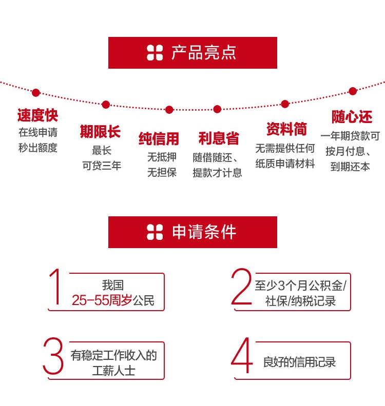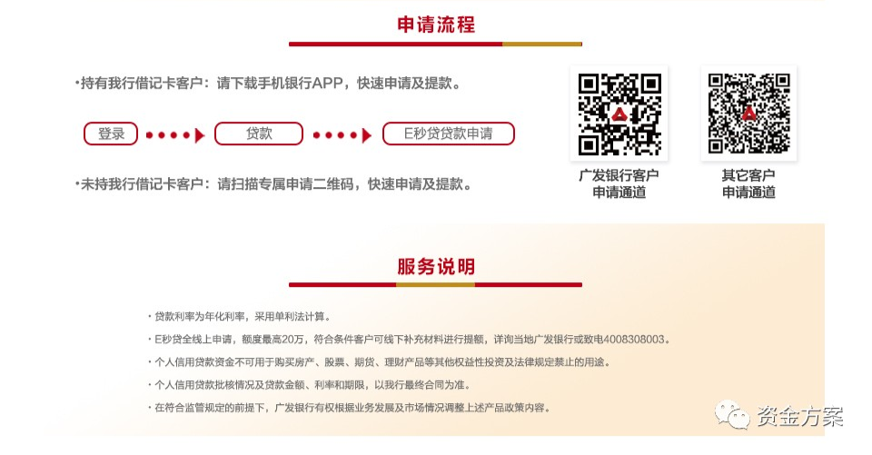 广发银行-广发E秒贷 “广发E秒贷”是广发银行面向优质客户提供的一笔用于购车、装修、婚庆、医疗等日常消费的生活备用金,具有无需提供任何纸质申请资料,审批放款快,资金使用灵活,随借随还、按日计息等特点。 01 广发银行E秒贷产品属性 额度:最高20万 申请人年龄:25-55周岁 期限:最长3年 时效:秒级审批,几分钟出结果 还款方式:1年期先息后本,随借随还。3年期额度循环使用,不提款不计息 利息:年化利率4.8%起 贷款用途:贷款可以用于家装、购车、教育、医疗等个人合法合理的消费支出,不得用于非声明用途和法律法规禁止的个人支出 02 广发银行E秒贷准入条件 准入条件 1、年龄:要求25—55岁 2、公积金:基数要求无(建议4000以上;社保基数3000以上) 3、缴纳时间要求:3个月以上(建议一年以上,过件率更高) 4、征信要求良好 5、现单位工作时间越长越好 征信要求(建议)