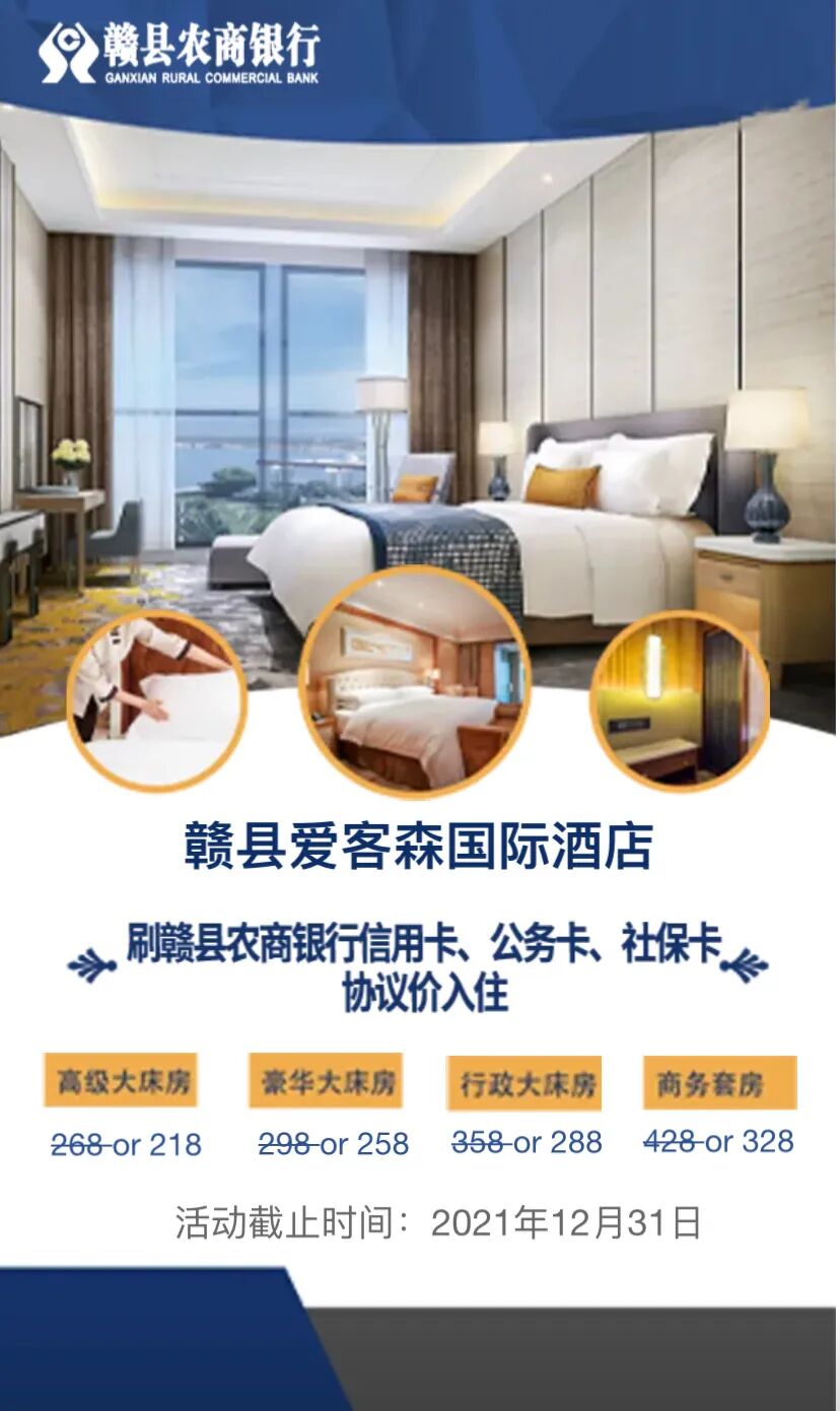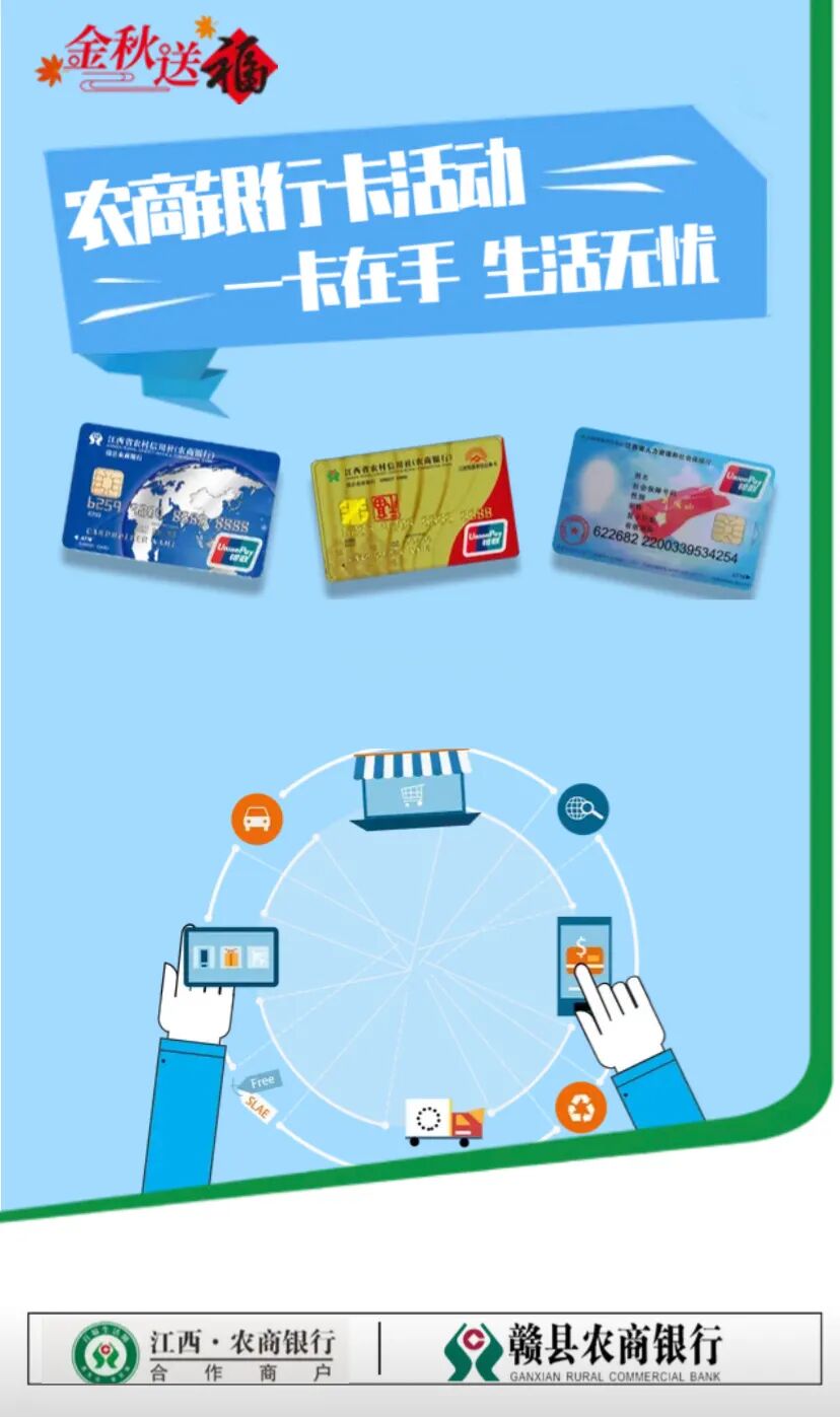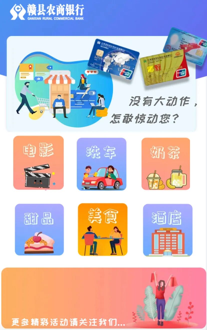 好消息!好消息!为了满足广大客户个人和家庭生活消费需求 赣县农商银行推出农商银行卡刷卡活动只要您有信用卡、公务卡、社保卡即可乐享不停 一卡在手 生活无忧有需求的小伙伴们快来刷卡消费吧 观影 奶茶 洗车 甜品 酒店 美食 (以上活动的最终解释权归赣县农商银行) 赣县农商银行信用卡 扫一扫二维码 或阅读原文 线上申请超简单 还有超多优惠等你来发现 赶紧来办理,把它带走吧! (信用卡申请二维码) 注:收到卡片后,客户本人持卡及身份证到赣县农商银行任一营业网点做面签后,即可激活使用! 更多详情请咨询 赣县农商银行各营业网点 — THE END — 来源:业务拓展部编辑:马有杰审核:陈贻龙 曾歆语 百福卡用户均可参与!支付宝绑卡消费领红包,还有支付满立减 赣县农商银行2022年新员工招聘正式启动 唱响红色歌曲,献礼百年华诞!赣县农商银行深情唱响《唱支山歌给党听》 了解更多知识,请关注卡神吧,为您提供信用卡、贷款、理财、保险等资讯及交流! 特别声明1、该文观点仅代表作者本人,卡神吧系信息发布平台,卡神吧仅提供信息存储空间服务。 2、您若发现有侵略您著作权行为,请及时告知,我们工作人员将在第一时间删除侵权作品、停止继续传播。 3、如果你喜欢这篇文章,请帮助我们转发它分享给你身边的好友。 |