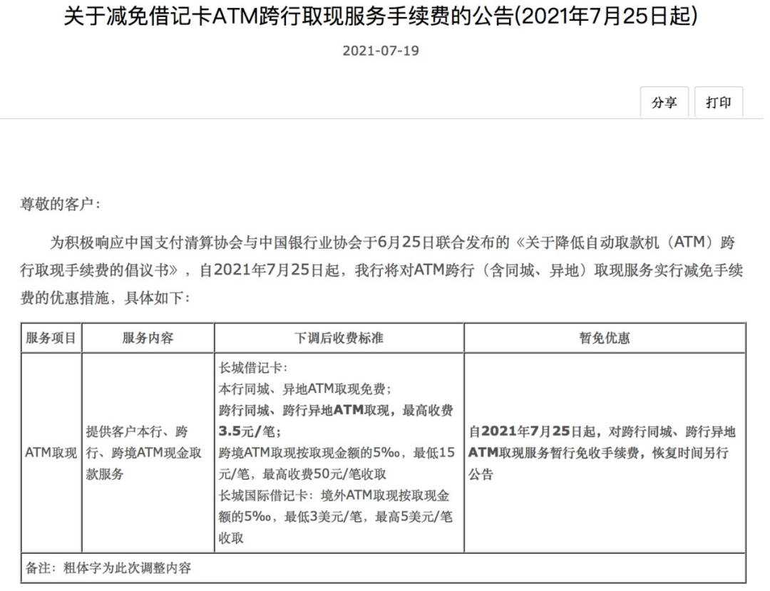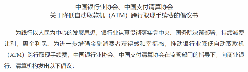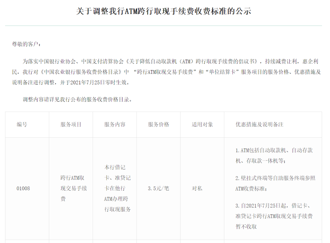 中国最大的农信联盟(关注10w+)! 自中国银行宣布免收借记卡ATM跨行取现手续费后,7月23日,工商银行、农业银行也发布调整ATM跨行取现服务收费标准的公告。 公告显示,7月25日起,两家银行将暂免收借记卡、准贷记卡境内ATM跨行取款手续费。 减免ATM跨行取现手续费 工商银行公告,为响应中国银行业协会、中国支付清算协会《关于降低自动取款机(ATM)跨行取现手续费的倡议书》,决定调整《中国工商银行服务价目表(2017年版)》中涉及ATM跨行取现服务的收费标准和优惠政策,并于2021年7月25日零时生效。 图片来源:工商银行官网 工商银行公告显示,自2021年7月25日起,针对个人存取款服务,暂免收借记卡境内跨行ATM取款手续费。 针对对公财智账户卡,暂免收本行和跨行自助渠道取款手续费。 针对全部信用卡存取款及转账汇款服务,暂免收准贷记卡境内跨行ATM取款手续费。 农业银行也公告称,自2021年7月25日起,借记卡、准贷记卡跨行ATM取现交易手续费暂不收取,跨行ATM取现交易手续费和本行ATM异地取现手续费暂不收取。 图片来源:农业银行官网 此外,公告还显示,农业银行本地存取现、本地转账汇款免费。 降费让利规模每年约40亿元 就在前几天,中国银行发布公告称,7月25日起免收借记卡ATM跨行取现手续费。 图片来源:中国银行官网 此次三家国有大行减免ATM跨行取现手续费的背景,主要源于6月25日中国银行业协会、中国支付清算协会联合发布的《关于降低自动取款机(ATM)跨行取现手续费的倡议书》。《倡议书》建议实施过渡期为一个月。 《倡议书》鼓励各银行和清算机构适当降低同城ATM跨行取现手续费和异地跨行取现手续费,收费标准不超过3.5元/笔。其中,发卡行减半收取手续费,收费标准不超过0.2元/笔;清算机构减半收取网络服务费,收费标准不超过0.3元/笔;布设ATM机具的收单行手续费标准不变,为3元/笔。 图片来源:银保监会网站 《倡议书》实施后,ATM跨行取现手续费将显著降低,同城业务降幅10%以上,大额异地业务降幅达80%以上。据初步测算,预计降费让利规模约每年40亿元。 中证君注意到,就在《倡议书》发布同日,六大国有银行和财付通、支付宝等相继发布公告、声明响应号召,不过部分机构的具体优惠政策和执行日期尚未公布。 来源于:小潴课堂 目前已有100000+农信员工加入我们 了解更多知识,请关注卡神吧,为您提供信用卡、贷款、理财、保险等资讯及交流! 特别声明1、该文观点仅代表作者本人,卡神吧系信息发布平台,卡神吧仅提供信息存储空间服务。 2、您若发现有侵略您著作权行为,请及时告知,我们工作人员将在第一时间删除侵权作品、停止继续传播。 3、如果你喜欢这篇文章,请帮助我们转发它分享给你身边的好友。 |