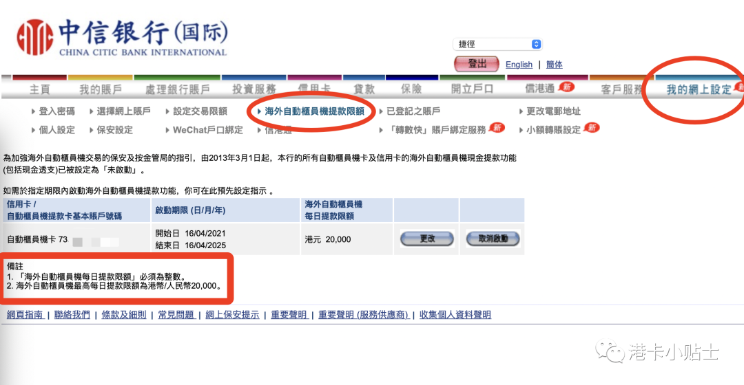 中信银行是一张双币提款卡,于同一张提款卡内可多达3个存款户口,包括港币及人民币。满足客户的跨境理财需要,随时随地提款,更可节省兑换开支。 中信银行国际的提款卡可以在中国大陆的ATM机取出人民币,也可以在香港取出港币,非常方便资金的出入。 很多中信下户的小伙伴还是一脸茫然,今天闹闹讲的内容就是中信香港卡的资金如何从香港回到大陆之ATM机取现。请各位路君注意查收: 额外提醒?:提款卡密码,在第一次开通中信银行国际账户的时候一起邮寄过来的。 现在让我们详细聊聊 ATM取现的流程和规则 需要设置海外自动柜员机取款这个功能,默认的情况是未启动的。(我这个已经设好之后的页面了) 点击【我的网上设定】-点击【海外自助柜员提现限额】-点击【启动】设置金额【20000RMB | HKD】。每日取款限额是2万港币。 题外话:有小伙伴就说了中信香港卡怎么一次只能取现20000元RMB?着急用钱的话,大额资金我根本等不及啊!ATM取现限额2万是人民银行的规定的,谁也改变不了,金额比较大的小伙伴那就推荐每日300万额度的汇丰给你,港陆互助免费,且秒到!!!世上没有绝对完美的卡,你欣赏它的优点就可以忽略它的缺点。 【港股打新·港卡】让我们全面来聊聊这张备受大家喜爱的外资卡——香港汇丰! 虽然香港中信支持3个账户,港币始终是第一账户,第二、第三账户你可以自主决定,具体操作拨打中信官方客户“400 842 5558”咨询。在?机取款默认扣款的是第一中信银行国际港币账户; 例如:在境内某ATM机取款1000RMB:若港币账户为2000HKD,人民币账户500RMB。这时候人民币账户余额不足,开启【自动户口调拨金额】功能,这时候后人民币账户资金缺口全部由基本账户支出。等于说取现的1000RMB,100%来自于基本账户中的港币调拨,而第二账户中资金保留。 在中国大陆的ATM机取款,每一笔需要15块人民币的手续费。建议用中信ATM取款机,避免二次收费。在中国大陆的ATM机取款,取出来的就是人民币。并且根据人民币和港币的实时汇率在港币账户扣除相应数量的港币。 以上便是中信香港卡之ATM机取现全部内容介绍。 · end · 也可以点击下方“阅读全文” 全面了解港股打新所有券商且开户 了解更多知识,请关注卡神吧,为您提供信用卡、贷款、理财、保险等资讯及交流! 特别声明1、该文观点仅代表作者本人,卡神吧系信息发布平台,卡神吧仅提供信息存储空间服务。 2、您若发现有侵略您著作权行为,请及时告知,我们工作人员将在第一时间删除侵权作品、停止继续传播。 3、如果你喜欢这篇文章,请帮助我们转发它分享给你身边的好友。 |