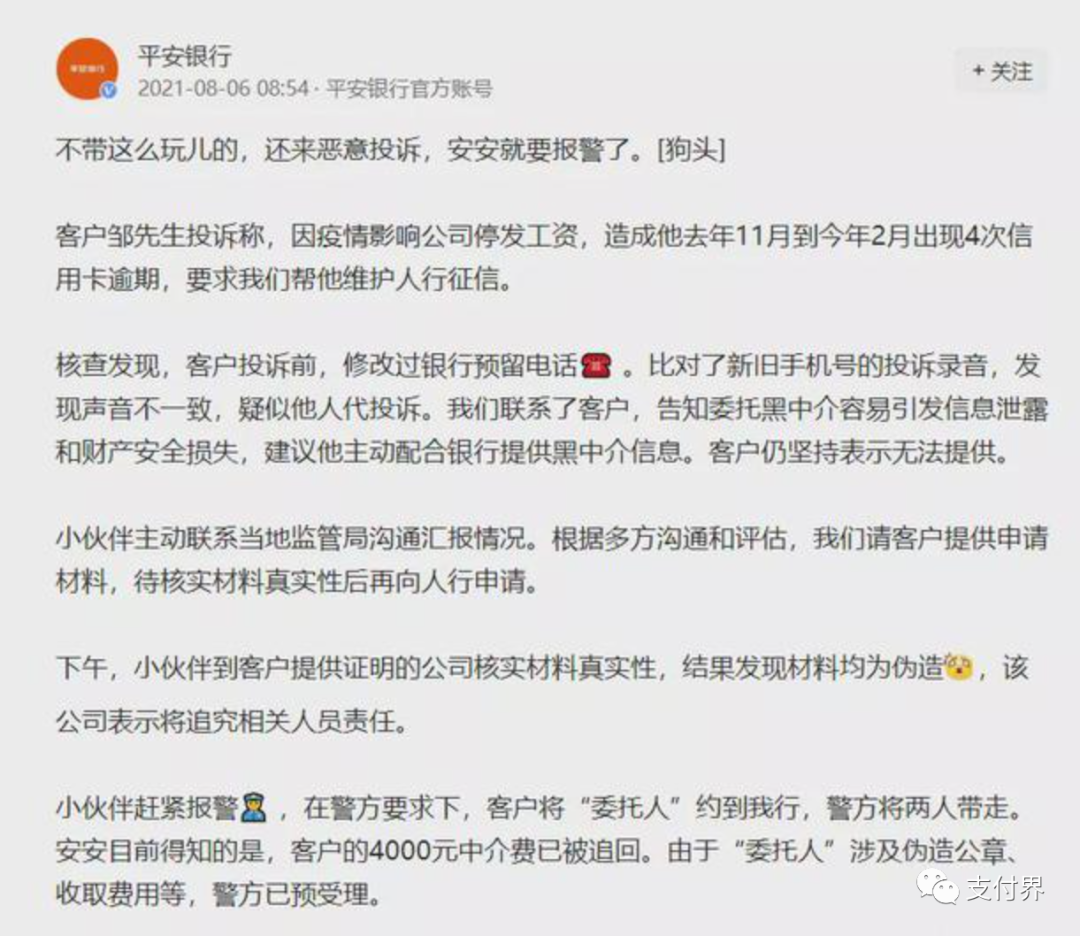 8月6日平安银行发布一条讯息,自己银行的客户信用卡逾期后,找黑中介恶意投诉银行。已被银行报警,并且抓捕归案。详细经过如下: 客户邹先生投诉称,因疫情影响公司停发工资,造成他去年11月到今年2月出现4次信用卡逾期,要求我们帮他维护人行征信。 核查发现,客户投诉前,修改过银行预留电话。比对了新旧手机号的投诉录音,发现声音不一致,疑似他人代投诉。我们联系了客户,告知委托黑中介容易引发信息泄露和财产安全损失,建议他主动配合银行提供黑中介信息。客户仍坚持表示无法提供。 小伙伴主动联系当地监管局沟通汇报情况。根据多方沟通和评估,我们请客户提供申请材料,待核实材料真实性后再向人行申请。 下午,小伙伴到客户提供证明的公司核实材料真实性,结果发现材料均为伪造,该公司表示将追究相关人员责任。 小伙伴赶紧报警 ,在警方要求下,客户将“委托人”约到我行,警方将两人带走。安安目前得知的是,客户的4000元中介费已被追回。由于“委托人”涉及伪造公章、收取费用等,警方已受理。 安安再次强调,不要相信那些给钱就可以帮忙维护征信的黑产中介。同时,也请那些黑中介们收手!安安可不是闹着玩儿的。 “恶意投诉”边界如何界定? 消费金融专家苏筱芮指出,捏造事实、虚构事实仅为“恶意投诉”的一种表现形式,“恶意投诉”应覆盖更为广泛的范围,例如对延期还款提出不合理要求,甚至要求本金打折等。 “通过捏造事实、虚构事实等方式举报的是‘恶意投诉’,之前确实存在这样的现象,但现在更多的是通过一定的法律手段和银行进行协商,但这些都不是真正的法律手段。”一位股份制银行信用卡中心相关人士向北京商报记者介绍称,这种行为影响了银行还款协商工作的正常开展,挤占了真正有延期合理性的客户需求。 另一位股份制银行人士也提及,“我们银行确实出现过很多恶意投诉的情况,有的持卡人信用卡逾期还不上,银行就打了两三次催收电话,都是正常的催收模式,也没有向持卡人进行施压,只是商量还款。持卡人转头就向监管投诉说银行恶意催收,泄露信息。还有的持卡人通过捏造信息,比如病例、困难证明等内容向监管投诉,然后监管再转发给银行,由银行进行协商”。 在一位国有大行信用卡中心人士看来,“这种协商诉讼其实就是相对‘柔和’方式的‘恶意投诉’,也是钻了一定的空子,打着法律的旗号,但也不是什么正规的法律手段”。 防范恶意投诉骗局维权谨记走合法途径 中国银保监会消费者权益保护局近期发布的《关于2020年第二季度银行业消费投诉情况的通报》显示,信用卡业务、个人贷款业务、理财类业务分列投诉前三名。其中,涉及信用卡业务投诉33732件,占投诉总量的50.2%。面对各类投诉,尤其是恶意投诉,中国银保监会和各银保监局通过以案说教、风险提示,提醒广大消费者提高警惕,以合法途径维护自身正当权益。 为积极响应监管机构政策号召,切实维护消费者合法权益,广发信用卡积极践行金融机构的责任与担当,推出系列措施保障消费者合法权益。广发信用卡建议消费者应选择正规渠道维护自身合法权益,如果对相关业务存在疑问,可通过官方客服进行咨询协商。若协商不成,还可通过申请行业组织或第三方机构进行调解。比如,广发信用卡在北京、上海、广州、珠海、温州五大城市成立信用卡调解中心,还与广州市金融消费纠纷人民调解委员会及上海市金融消费纠纷调解中心达成战略合作,联合开展信用卡纠纷非诉化解工作,有效化解金融纠纷并维护消费者合法权益,促进信用卡消费市场健康稳定运行。此外,广发信用卡还提醒消费者注意保护个人信息,切勿轻易泄露;理性消费,误信误导宣传;三思而后行,远离恶意投诉及金融诈骗。文章来源:支付界 往期经典回顾 识破“征信修复师”的骗局! 不良征信能“修复”吗? 频陷“恶意投诉”困扰,银行到底惹了谁? 征信报告不良记录5年后会自动清除吗? 征信出现这六种情况,就不能申请贷款了! 个人征信逾期记录,多久会消除? 建行装修分期 | 升级100万额度,8年还款 行业投顾 银行业 融媒体! 金融信息、银行资讯,一网打尽! 长按识别上方二维码,轻松关注 点分享 点收藏 点点赞 点在看 了解更多知识,请关注卡神吧,为您提供信用卡、贷款、理财、保险等资讯及交流! 特别声明1、该文观点仅代表作者本人,卡神吧系信息发布平台,卡神吧仅提供信息存储空间服务。 2、您若发现有侵略您著作权行为,请及时告知,我们工作人员将在第一时间删除侵权作品、停止继续传播。 3、如果你喜欢这篇文章,请帮助我们转发它分享给你身边的好友。 |