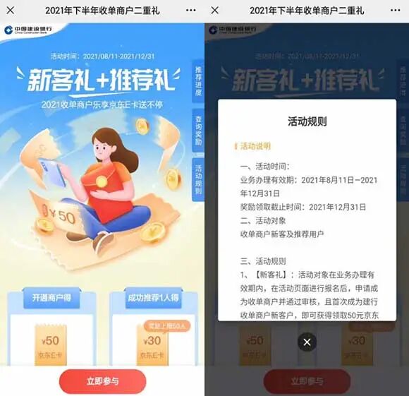 点击↑↑↑蓝字 关注 全民淘福利 ID: qmtaocom 顺便说一下,关注“全民淘福利”或"qmtaocom"公众号,回复 视频会员、外卖、无限卡、寄件、出行、话费、助力、手机号、群聊 等 各种优惠信息总有需要的! 移动花卡 电信星卡 2021校园卡 联通月包年包 话费流量充值 免费水果 每日外卖红包 红包汇总 云闪付红包 哪里买 或 Q群 8808071 24小时线报 KFC 社区买菜 申请建设银行商户收款码免费领取50元京东E卡 微信打开链接进入活动,输入相关信息报名提交即可申请建行商户收款码 通过申请后可获得50元京东E卡,还可以去邀请好友,每成功邀请1人可获得30元E卡,好友可获得50元京东E卡 最高可得1500元京东E卡,申请的银行收款码以后也可以用来收款什么的 有需要的小伙伴们可以去申请一下! 活动地址:https://sourl.cn/GReuU6 猜 您 喜 欢 中国联通新米粉卡 米粉王卡、米粉PRO 19元/月 中国联通新天神卡 19元/月 3G+100分钟 免费设置5个新情号免费打 美团APP新用户0.99元冲10元三网话费 老用户也可以参加 有5元红包 苏宁新人 超级福利节 领30-30元无门槛券 0撸实物包邮 活动继续 每日必做红包汇总!线下、公交、境外、线上支付、余额宝等红包 优惠价购买肯德基、星巴克等,优惠吃喝玩乐 优惠寄快递最高便宜一半多!白鸽惠递 前三次低至5元 送你终身免费腾讯视频or爱奇艺会员vip 更多好活动,可以在公众号回复“搜索”-“号内搜” 进行查找 点击下方“阅读原文”查看更多 全民淘 www.qmtao.com 了解更多知识,请关注卡神吧,为您提供信用卡、贷款、理财、保险等资讯及交流! 特别声明1、该文观点仅代表作者本人,卡神吧系信息发布平台,卡神吧仅提供信息存储空间服务。 2、您若发现有侵略您著作权行为,请及时告知,我们工作人员将在第一时间删除侵权作品、停止继续传播。 3、如果你喜欢这篇文章,请帮助我们转发它分享给你身边的好友。 |